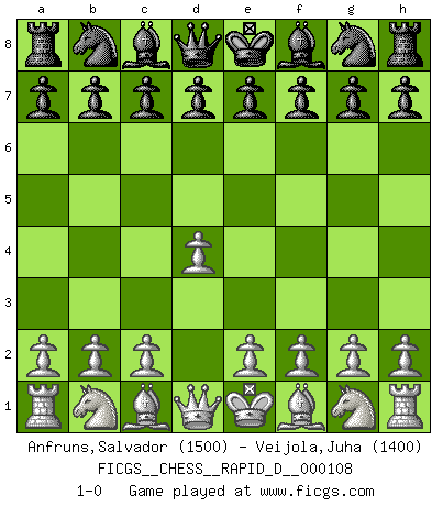Last move : 1-0 2018 February 20 2:46:18 [Event "FICGS__CHESS__RAPID_D__000108"] [Site "FICGS"] [Date "2018.01.21"] [Round "1"] [White "Anfruns,Salvador"] [Black "Veijola,Juha"] [Result "1-0"] [WhiteElo "1500"] [BlackElo "1400"] 1.d4 1-0 This chess game has been lost on time (started : 2018.01.21 0:15:20) Queen's pawn Player White won this chess game. Follow this game move after move (download)Chess is a sea in which a gnat may drink and an elephant may bathe. (Hindu proverb) Lisa Lane, amerikanische Schachmeisterin, hatte Fischer einmal als stärksten lebenden Spieler bezeichnet. Antwort: Das ist richtig, aber Lisa Lane ist eigentlich nicht in der Lage, das zu beurteilen. (Robert James Fischer) Un entendimiento a fondo de las continuaciones típicas del mate, hace de las combinaciones de sacrificio mas complicadas conducirlas a ellas no solo sin dificultad, sino casi de una manera natural. (Siegbert Tarrasch) Je ne crois pas en la psychologie, je crois aux bons coups. (Robert Fischer) No, I am still playing. (Anatoly Karpov)