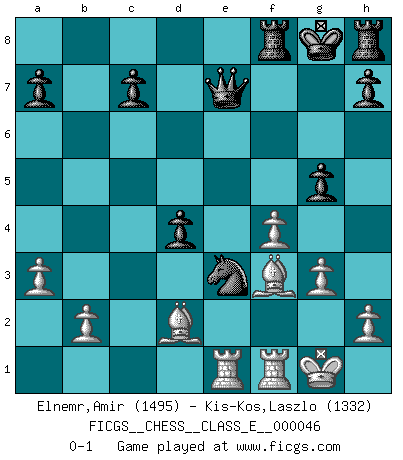 Last move : 0-1 2007 June 5 0:7:28 [Event "FICGS__CHESS__CLASS_E__000046"] [Site "FICGS"] [Date "2007.04.22"] [Round "1"] [White "Elnemr,Amir"] [Black "Kis-Kos,Laszlo"] [Result "0-1"] [WhiteElo "1495"] [BlackElo "1332"] 1.e4 e5 2.Nf3 Nc6 3.Bc4 Nf6 4.Ng5 d5 5.exd5 b5 6.Bf1 Nd4 7.c3 Nxd5 8.Nxf7 Kxf7 9.cxd4 exd4 10.Qf3+ Kg8 11.Bxb5 Qe7+ 12.Be2 Qe5 13.d3 Bf5 14.g3 Bb4+ 15.Nd2 Rf8 16.a3 Bg6 17.Qg4 Bxd2+ 18.Bxd2 Bxd3 19.f4 Qe7 20.Qf3 Be4 21.O-O Bxf3 22.Bxf3 Ne3 23.Rae1 g5 0-1 Two knights defense : Ulvestad variation Kingside Castling by player White (move 21) Player Black won this chess game. Follow this game move after move (download)A sacrifice is best refuted by accepting it. (Wilhelm Steinitz) Der Umstand, daß uns eine 7 Stunden Zeitkontrolle ermöglicht eine großartige, tiefe Partie zu spielen, ist für die Massenmedien nicht weiter von Bedeutung. (Alexej Shirov) Los errores estan ahí, esperando a que se cometan. (Savielly Tartakower) Ce qui est bien, c'est d'avoir tout un tas de pièces en prise : l'adversaire ne peut en prendre qu'une à la fois. Cité par Thierry Audin. Without deviation from the norm, progress is not possible. (Frank Zappa)
