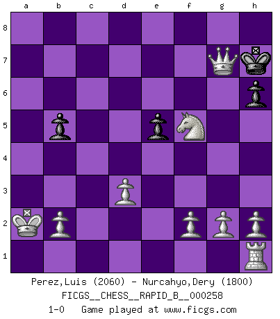 Last move : 1-0 2018 March 21 3:37:11 [Event "FICGS__CHESS__RAPID_B__000258"] [Site "FICGS"] [Date "2018.01.21"] [Round "1"] [White "Perez,Luis"] [Black "Nurcahyo,Dery"] [Result "1-0"] [WhiteElo "2060"] [BlackElo "1800"] 1.e4 c5 2.Nf3 d6 3.d4 Nf6 4.dxc5 Nxe4 5.cxd6 Nxd6 6.Bf4 Nc6 7.Nc3 e6 8.Qe2 Qb6 9.O-O-O h6 10.Bxd6 Bxd6 11.Rxd6 Ke7 12.Nd5+ Kxd6 13.Nxb6 axb6 14.Qe3 Rxa2 15.Kb1 Ra5 16.Qxb6 Rd8 17.Nd4 Rd5 18.Nxc6 Rd1+ 19.Ka2 Rd7 20.Na7 Ke5 21.Nxc8 R7d2 22.Qe3+ Kf6 23.Qf4+ Kg6 24.Ne7+ Kh7 25.Qxf7 Rd8 26.Bd3+ R1xd3 27.cxd3 e5 28.Qg6+ Kh8 29.Nf5 Rd7 30.Qe8+ Kh7 31.Qxd7 b5 32.Qxg7+ 1-0 Sicilian Queenside Castling by player White (move 9) Player White won this chess game. Follow this game move after move (download)A Chess game is a dialogue, a conversation between a player and his opponent. Each move by the opponent may contain threats or be a blunder, but a player cannot defend against threats or take advantage of blunders if he does not first ask himself: What is my opponent planning after each move ? (Bruce A. Moon) In Buenos Aires ist es nicht mein vorrangiges Ziel ein starkes Turnier zu organisieren, sondern ein Turnier für Gentlemen. Ich würde nie Kamsky einladen. Ich mag keine Probleme. (Miguel Najdorf) Una victoria por una combinación errónea, aunque sea espectacular, me llena de horror artístico. (Wilhelm Steinitz) Les échecs sont un jeu terrible. Si vous n'avez pas le centre, votre adversaire a une position plus libre. Par contre, si vous avez le centre, alors vous avez vraiment quelque chose pour laquelle vous inquiéter ! (Siegbert Tarrasch) You think that education is too expensive ? Try ignorance. (Derek Bok)