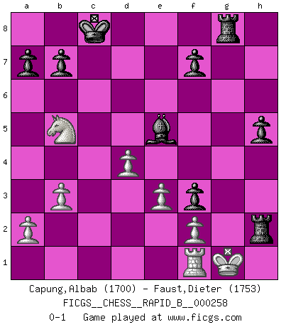Last move : 0-1 2018 February 15 16:15:50 [Event "FICGS__CHESS__RAPID_B__000258"] [Site "FICGS"] [Date "2018.01.21"] [Round "1"] [White "Capung,Albab"] [Black "Faust,Dieter"] [Result "0-1"] [WhiteElo "1700"] [BlackElo "1753"] 1.e3 d5 2.c4 e6 3.cxd5 exd5 4.Qf3 Nf6 5.b3 Bg4 6.Qg3 Bd6 7.Qh4 h6 8.Bb2 g5 9.Bxf6 Qxf6 10.Qxg4 Qxa1 11.Bd3 Nd7 12.Nf3 Nc5 13.Bf5 h5 14.Qxg5 Ne4 15.Bxe4 dxe4 16.O-O exf3 17.Nc3 Qb2 18.Nd5 Qe5 19.Qxe5+ Bxe5 20.d4 O-O-O 21.Nxc7 Rhg8 22.Nb5 Rxg2+ 23.Kh1 Rxh2+ 24.Kg1 Rg8+ 0-1 Van't Kruijs Opening Kingside Castling by player White (move 16) Queenside Castling by player Black (move 20) Player Black won this chess game. Follow this game move after move (download)Chess is played with the mind and not with the hands ! (Renaud and Kahn) Du kannst im Schach nur gut werden, wenn du das Spiel liebst. (Robert James Fischer) El ganar no lo es todo... pero el perder es nada. (Mednis) Horreur, mais aussi harmonie suprême : qu'y avait-il en effet au monde en dehors des échecs ? Le brouillard, l'inconnu, le non-être... (Vladimir Nabokov) Fame, I have already. Now I need the money. (an elderly Steinitz)