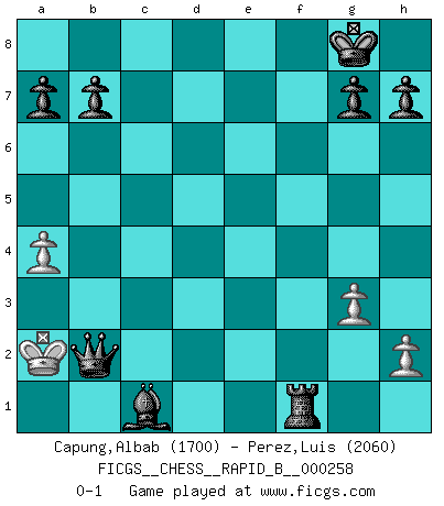 Last move : 0-1 2018 February 7 18:21:4 [Event "FICGS__CHESS__RAPID_B__000258"] [Site "FICGS"] [Date "2018.01.21"] [Round "1"] [White "Capung,Albab"] [Black "Perez,Luis"] [Result "0-1"] [WhiteElo "1700"] [BlackElo "2060"] 1.e3 Nf6 2.a3 d5 3.c4 e5 4.cxd5 Nxd5 5.Qf3 Be6 6.Nc3 Nc6 7.Bc4 Nxe3 8.Bxe6 Nc2+ 9.Kd1 fxe6 10.Kxc2 Nd4+ 11.Kb1 Nxf3 12.Nxf3 e4 13.Ne1 Qd4 14.Nb5 Qc4 15.a4 Be7 16.Nc2 O-O 17.Re1 Rxf2 18.Ne3 Qd3+ 19.Nc2 Bc5 20.Nxc7 Rc8 21.Re3 Bxe3 22.Ra3 Bxd2 23.Rxd3 exd3 24.Nb4 Rxc7 25.Nxd3 Rxc1+ 26.Nxc1 Rf1 27.Kc2 Bxc1 28.Kb1 e5 29.Ka2 e4 30.g3 e3 31.Kb1 e2 32.Ka2 e1Q 33.Kb1 Qd2 34.Ka2 Qxb2+ 0-1 Van't Kruijs Opening Kingside Castling by player Black (move 16) Promotion Queen by player Black (move 32) Player Black won this chess game. Follow this game move after move (download)What is the object of playing a gambit opening?... To acquire a reputation of being a dashing player at the cost of losing a game. (Siegbert Tarrasch) Es liegt in der Natur, vernüftig zu denken und unlogisch zu handeln. (Anatole France) No hay precio que no valga la pena por la cabellera del Rey enemigo. (Koblentz) Tout change constamment, y compris dans le monde des Echecs. (Botvinnik) Excelling at chess has long been considered a symbol of more general intelligence. That is an incorrect assumption in my view, as pleasant as it might be. But for the purposes of argument and investigation, chess is, in Russkin-Gutman's words, 'an unparalleled laboratory, since both the learning process and the degree of ability obtained can be objectified and quantified, providing an excellent comparative framework on which to use rigorous analytical techniques.' (The Chess Master and the Computer, by Garry Kasparov - 2010)