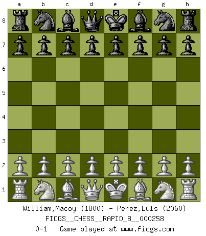 Last move : 0-1 2018 February 20 2:40:34 [Event "FICGS__CHESS__RAPID_B__000258"] [Site "FICGS"] [Date "2018.01.21"] [Round "1"] [White "William,Macoy"] [Black "Perez,Luis"] [Result "0-1"] [WhiteElo "1800"] [BlackElo "2060"] 0-1 This chess game has been lost on time (started : 2018.01.21 1:38:11) Player Black won this chess game. Follow this game move after move (download)Life is a kind of Chess, with struggle, competition, good and ill events. (Benjamin Franklin) Ein Kibitz ist einer, der deinem Gegner gute Ratschläge gibt. (Andrew Soltis) Aquellos que dicen que entienden al Ajedrez, no entienden nada. (Robert Hubner) Le génie consiste à savoir transgresser les règles au moment opportun. (Teichmann) Employ the attack like tactic of defense. (Chinese proverb)