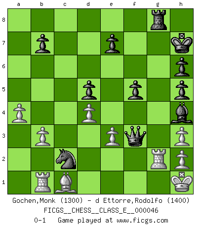 Last move : 0-1 2007 July 24 20:38:54 [Event "FICGS__CHESS__CLASS_E__000046"] [Site "FICGS"] [Date "2007.04.22"] [Round "1"] [White "Gochen,Monk"] [Black "d Ettorre,Rodolfo"] [Result "0-1"] [WhiteElo "1300"] [BlackElo "1400"] 1.Nf3 Nf6 2.d4 d6 3.e3 g6 4.Ng5 Bg7 5.Bc4 O-O 6.Qf3 d5 7.Bb3 h6 8.Nh3 Bg4 9.Qg3 Qd7 10.f3 Bxh3 11.gxh3 a5 12.Nc3 a4 13.Nxa4 Rxa4 14.Bxa4 Qxa4 15.Qxc7 Nc6 16.b3 Qa6 17.Qf4 Nh5 18.Qg4 Nb4 19.Kf2 Nxc2 20.Rb1 f5 21.Qh4 Bf6 22.Qxh5 gxh5 23.Rg1+ Kh7 24.a4 Bh4+ 25.Kg2 Qe2+ 26.Kh1 Qxf3+ 27.Rg2 Rg8 0-1 Reti Opening Kingside Castling by player Black (move 5) Player Black won this chess game. Follow this game move after move (download)A man without frontiers. He didn't divide the East and the West, he brought them together in their admiration for him. (Ljubomir Ljubojevic, about Bobby Fischer's death) Ich organisiere ein großes Turnier, was mich etwa 120000 Dollar kostet. Ich denke, das ist das erste Mal in der Schachgeschichte, daß ein Schachgroßmeister auch als Mäzen auftritt. (Miguel Najdorf) El Ajedrez te enseña a controlarl la excitación inicial que sientes cuando vez algo que parece bueno y te enseña a pensar objetivamente cuando te encuentras en problemas. (Stanley Kubrick) Les échecs, c'est l'art d'analyser. (Mikhail Botvinnik) There are lots of people who mistake their imagination for their memory. (Josh Bilings)