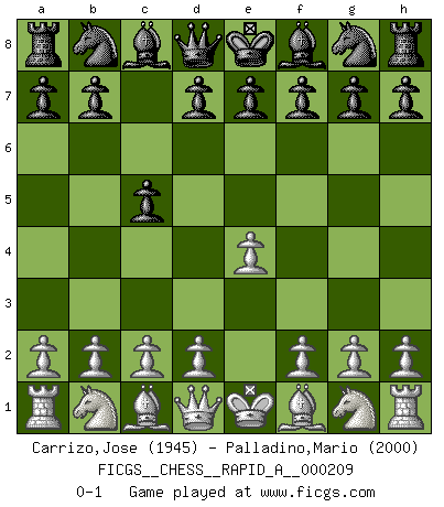 Last move : 0-1 2018 February 23 3:4:29 [Event "FICGS__CHESS__RAPID_A__000209"] [Site "FICGS"] [Date "2018.01.22"] [Round "1"] [White "Carrizo,Jose"] [Black "Palladino,Mario"] [Result "0-1"] [WhiteElo "1945"] [BlackElo "2000"] 1.e4 c5 0-1 This chess game has been lost on time (started : 2018.01.22 14:59:35) Sicilian defense Player Black won this chess game. Follow this game move after move (download)The hallmark of the artist is simplicity. (Larry Evans) Dieses schreckliche Gefühl, dass ich gegen eine Maschine spielte, die niemals Fehler macht, zerschmetterte meinen Widerstand. (Mark Taimanov) Observen a Garry Kasparov. Después de una derrota, invariablemente el gana la próxima partida. Prácticamente hace pedazos a su siguiente oponente. Eso es algo que tenemos que aprender a lograr. (Maurice Ashley) La vérité est comme le meilleur coup aux échecs : elle existe, mais il faut la chercher. (Arturo Perez-Reverte) Opportunities multiply as they are seized. (Sun Tzu)