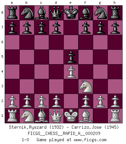 Last move : 1-0 2018 February 23 3:4:29 [Event "FICGS__CHESS__RAPID_A__000209"] [Site "FICGS"] [Date "2018.01.22"] [Round "1"] [White "Sternik,Ryszard"] [Black "Carrizo,Jose"] [Result "1-0"] [WhiteElo "1932"] [BlackElo "1945"] 1.e4 e5 2.Nf3 1-0 This chess game has been lost on time (started : 2018.01.22 14:59:35) King's knight Opening Player White won this chess game. Follow this game move after move (download)Fischer, who may or may not be mad as a hatter, has every right to be horrified. (Jeremy Silman) Korrekt heißt in Deutschland die Haltung eines Mannes, dessen Benehmen nach dem Urteile seiner Nachbarn seiner Stellung angemessen ist. Um korrekt zu sein, muß man sich der Meinung der anderen anpassen... (Emanuel Lasker) Cuando no sepas que mover, espera por una idea que se le venga a la la cabeza de tu oponente. Tenlo por seguro de que esa idea estará incorrecta. (Siegbert Tarrasch) J'ai vu le vaincu d'Echecs jouer des années durant dans l'espoir de la fête de la victoire. Car tu es plus riche de ce qu'elle existe si même elle n'est point pour toi. Ainsi de la perle du fond des mers. (Antoine de Saint-Exupéry) Mandala - that's it! 16x16 squares as multiple of the four and the eight because of the Four Noble Truths and the Noble Eightfold Path. (Heinz-Georg Lehnhoff about Big Chess)