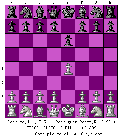 Last move : 0-1 2018 February 23 15:3:52 [Event "FICGS__CHESS__RAPID_A__000209"] [Site "FICGS"] [Date "2018.01.22"] [Round "1"] [White "Carrizo,Jose"] [Black "Rodriguez Perez,Rene"] [Result "0-1"] [WhiteElo "1945"] [BlackElo "1970"] 1.e4 e6 0-1 This chess game has been lost on time (started : 2018.01.22 14:59:35) French defense Player Black won this chess game. Follow this game move after move (download)Fischer was a master of clarity and a king of artful positioning. His opponents would see where he was going but were powerless to stop him. (Bruce Pandolfini) Wenn du nicht weißt was du tun sollst, warte bis dein Gegner eine Idee hat. Sie wird sicher schlecht sein. (Siegbert Tarrasch) El Ajedrez es un invernadero donde los frutos del carácter pueden madurar mas completamente que en la vida. (Edward Morgan Foster) Les échecs sont un jeu terrible. Si vous n'avez pas le centre, votre adversaire a une position plus libre. Par contre, si vous avez le centre, alors vous avez vraiment quelque chose pour laquelle vous inquiéter ! (Siegbert Tarrasch) In theory there is no difference between theory and practice. In practice there is. (Yogi Berra)