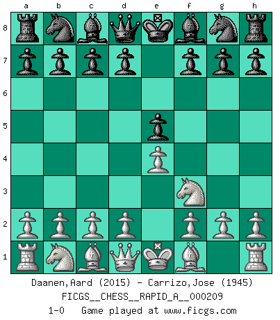 Last move : 1-0 2018 February 23 3:4:29 [Event "FICGS__CHESS__RAPID_A__000209"] [Site "FICGS"] [Date "2018.01.22"] [Round "1"] [White "Daanen,Aard"] [Black "Carrizo,Jose"] [Result "1-0"] [WhiteElo "2015"] [BlackElo "1945"] 1.e4 e5 2.Nf3 1-0 This chess game has been lost on time (started : 2018.01.22 14:59:35) King's knight Opening Player White won this chess game. Follow this game move after move (download)All that matters on the Chessboard is good moves. (Bobby Fischer) Ich tröste mich mit dem Vergnügen, daß Schachfans, Zuschauer und Leser glücklich sind, wenn ein Großmeister etwas riskiert, statt nur Klötzchen zu schieben. (Mikhail Nekhemyevich Tal) Si pudieramos observar el interior de la cabeza de un jugador de Ajedrez, encontraríamos ahí un mundo lleno de sentimientos, imágenes, ideas, emoción y pasión. (Alfred Binet) Le plus grand jeu de l'esprit jamais inventé, plus vous l'apprenez, plus vous y prenez du plaisir. (Garry Kasparov) You can only get smarter by playing a smarter opponent. (Revolver, movie)