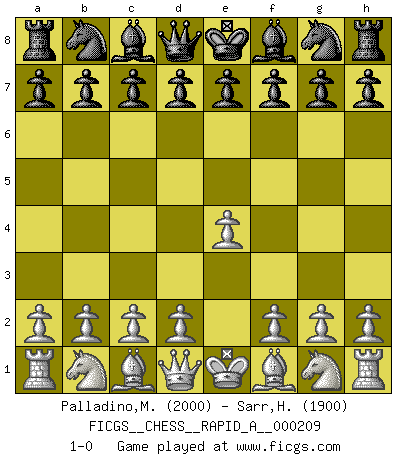 Last move : 1-0 2018 February 22 2:48:16 [Event "FICGS__CHESS__RAPID_A__000209"] [Site "FICGS"] [Date "2018.01.22"] [Round "1"] [White "Palladino,Mario"] [Black "Sarr,Henry Pierre"] [Result "1-0"] [WhiteElo "2000"] [BlackElo "1900"] 1.e4 1-0 This chess game has been lost on time (started : 2018.01.22 14:59:35) King's pawn Opening Player White won this chess game. Follow this game move after move (download)Fischer prefers to enter Chess history alone. (Miguel Najdorf) Am wohlsten fühle ich mich, wenn ich sehe, wie sich mein Gegner im Todeskampf windet. (Robert James Fischer) El muchacho (en ese entonces un niño de 12 años llamado Anatoly Karpov) no tiene ni idea de lo que es el Ajedrez y no hay futuro en absoluto para el en esta profesión. (Mikhail Botvinnik) On est toujours la mazette de quelqu'un d'autre. (Anonyme) Always two there are. No more no less. A master, and an apprentice. (Master Yoda in Star Wars ep.1)