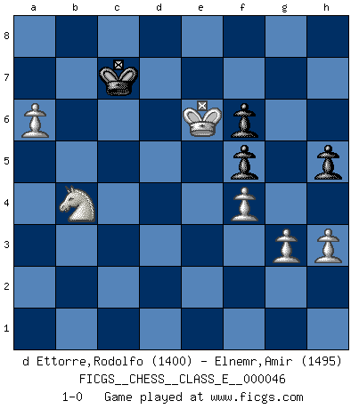 Last move : 1-0 2007 August 27 8:34:12 [Event "FICGS__CHESS__CLASS_E__000046"] [Site "FICGS"] [Date "2007.04.22"] [Round "1"] [White "d Ettorre,Rodolfo"] [Black "Elnemr,Amir"] [Result "1-0"] [WhiteElo "1400"] [BlackElo "1495"] 1.e4 d5 2.exd5 Nf6 3.c4 c6 4.d4 cxd5 5.Nc3 e6 6.cxd5 exd5 7.Bb5+ Nc6 8.Nf3 Bd6 9.Bg5 Bc7 10.Qe2+ Be6 11.Bxf6 gxf6 12.O-O Qd6 13.g3 O-O-O 14.Bxc6 Qxc6 15.Nb5 Qa6 16.Rac1 Rd7 17.Rc3 Kb8 18.Ra3 Qb6 19.Rxa7 R7d8 20.Ra3 Bd7 21.Nxc7 Kxc7 22.Qe7 Qe6 23.Rc1+ Kb8 24.Qc5 Bc6 25.b4 Qd6 26.Qa7+ Kc7 27.b5 Ra8 28.Rxc6+ Qxc6 29.bxc6 Rxa7 30.Rxa7 Kxc6 31.Nh4 Re8 32.Kf1 Re7 33.Nf5 Rc7 34.Ra5 Kb6 35.Rc5 Rxc5 36.dxc5+ Kxc5 37.Ke2 Kc4 38.Nd6+ Kc3 39.Nxb7 d4 40.Nc5 Kc4 41.Nd3 Kc3 42.Nc1 f5 43.a3 f6 44.f4 h6 45.h3 Kc4 46.Kd2 d3 47.Nxd3 Kd4 48.a4 h5 49.a5 Kd5 50.a6 Kc6 51.Nb4+ Kb6 52.Kd3 Kc7 53.Kd4 Kb6 54.Kd5 Kc7 55.Ke6 1-0 Scandinavian gambit Kingside Castling by player White (move 12) Queenside Castling by player Black (move 13) 10 pieces endgame at move 47 : White KNPPPP , Black KPPP WHITE : King + 1 Knight 4 Pawns BLACK : King + 3 Pawns Player White won this chess game. Follow this game move after move (download)Chess is war over the board. The object is to crush the opponents mind. (Bobby Fischer) Wer mein Gambit spielt, muß bereit sein, alle Brücken hinter sich abzubrechen. Es verändert den ganzen Menschen. Es wirkt wie ein Zauberstab und fördert verkümmerte, gute Charakter- eigenschaften wieder zu Tage. (Emil Joseph Diemer) El Ajedrez es un juego terrible. Si no dominas el centro, tu oponente tiene una posición mas libre. Si tu tienes el centro, entonces realmente tienes algo de que preocuparte. (Siegbert Tarrasch) Toute estimation doit être constamment réévaluée. (Jacob Estrin) Warrior pose battles inner weakness and wins focus. You see that there is no war within you. You're on your own side, and you are your own strength. (Terri Guillemets)