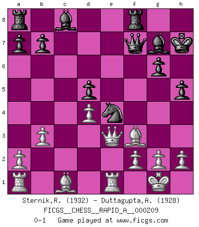 Last move : 0-1 2018 March 18 20:20:12 [Event "FICGS__CHESS__RAPID_A__000209"] [Site "FICGS"] [Date "2018.01.22"] [Round "1"] [White "Sternik,Ryszard"] [Black "Duttagupta,Aniruddha"] [Result "0-1"] [WhiteElo "1932"] [BlackElo "1928"] 1.e4 d5 2.exd5 Qxd5 3.Nc3 Qd6 4.d4 Nf6 5.Nf3 c6 6.Ne5 Nbd7 7.Nc4 Qc7 8.Be2 g6 9.O-O Bg7 10.Re1 O-O 11.Bf3 Nb6 12.Ne5 Nfd7 13.Ng4 h5 14.Nh6+ Kh7 15.Qd2 Nc4 16.Qd3 Ndb6 17.b3 Nd6 18.Qe3 Nd5 19.Nxd5 cxd5 20.c3 Ne4 21.c4 e6 22.cxd5 exd5 23.Nxf7 Qxf7 0-1 Scandinavian : Pytel-Wade variation Kingside Castling by player White (move 9) Kingside Castling by player Black (move 10) Player Black won this chess game. Follow this game move after move (download)I like to say that Bobby Fischer was the greatest player ever. But what made Fischer a genius was his ability to blend an American freshness and pragmatism with Russian ideas about strategy. (Bruce Pandolfini) Gott hat gewollt, dass ich Champion werde. (Surab Azmajparaschvili) Durante una competencia de Ajedrez, un Maestro de Ajedrez deberá ser una combinación de presa de caza y un Monge. (Alexander Alekhine) La solitude du joueur d'Echecs à l'approche du mat est semblable à celle du condamné. (Francis Szpiner) Plans are ideas that never come to fruition. (Daniel Parmet)