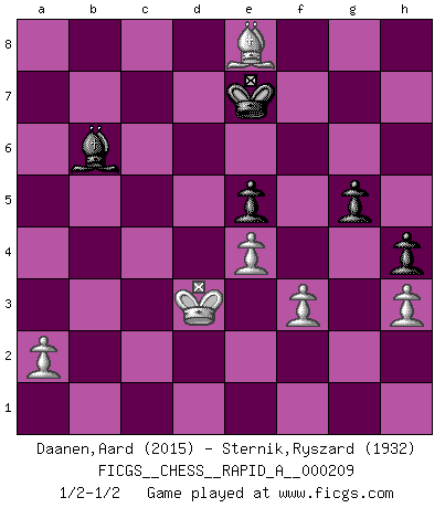 Last move : 1/2-1/2 2018 February 21 16:5:4 [Event "FICGS__CHESS__RAPID_A__000209"] [Site "FICGS"] [Date "2018.01.22"] [Round "1"] [White "Daanen,Aard"] [Black "Sternik,Ryszard"] [Result "1/2-1/2"] [WhiteElo "2015"] [BlackElo "1932"] 1.d4 Nf6 2.c4 e6 3.Nf3 d5 4.Nc3 c6 5.Bg5 h6 6.Bxf6 Qxf6 7.e3 Nd7 8.Bd3 dxc4 9.Bxc4 g6 10.O-O Bg7 11.e4 e5 12.d5 Nb6 13.Bb3 Bg4 14.Rc1 Rc8 15.dxc6 bxc6 16.Na4 O-O 17.Rc3 Rfd8 18.Qe2 Nxa4 19.Bxa4 Bf8 20.Rfc1 Bb4 21.Rxc6 Rxc6 22.Rxc6 Bxf3 23.Qxf3 Qxf3 24.gxf3 Rd2 25.Bb3 Kg7 26.Rc7 h5 27.Rxf7+ Kh6 28.Rxa7 Bc5 29.Rc7 Bxf2+ 30.Kf1 Rxb2 31.Rc2 Rxc2 32.Bxc2 Bb6 33.Ba4 Kg5 34.Be8 h4 35.h3 Kf6 36.Ke2 g5 37.Kd3 Ke7 1/2-1/2 Queen's pawn game Kingside Castling by player White (move 10) Kingside Castling by player Black (move 16) This chess game ended in a draw. Follow this game move after move (download)Examine moves that smite! A good eye for smites is far more important than a knowledge of strategical principles. (Purdy) Karpov ist ein Museumsstück. (Garry Kasparov) El tablero es el mundo, las piezas es el fenomeno del universo, las reglas del juego son lo que llamamos leyes de la naturaleza y el jugador del lado opuesto, se encuentra oculto a nuestra vista. (Thomas Huxley) J'ai toujours senti une vague pitié pour l'homme qui ne connaît rien aux échecs, tout comme j'en aurais pour un homme ignorant de l'amour. Les Echecs, comme la musique ou comme l'amour, ont le pouvoir de rendre heureux. (Siegbert Tarrasch) Life is painting a picture, not doing a sum. (Oliver Wendell Holmes, Jr.)