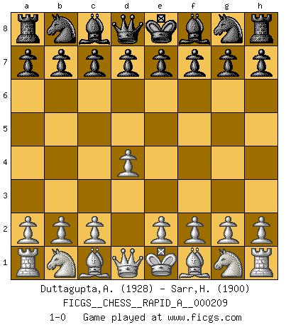 Last move : 1-0 2018 February 23 3:4:29 [Event "FICGS__CHESS__RAPID_A__000209"] [Site "FICGS"] [Date "2018.01.22"] [Round "1"] [White "Duttagupta,Aniruddha"] [Black "Sarr,Henry Pierre"] [Result "1-0"] [WhiteElo "1928"] [BlackElo "1900"] 1.d4 1-0 This chess game has been lost on time (started : 2018.01.22 14:59:35) Queen's pawn Player White won this chess game. Follow this game move after move (download)When you don't know what to play, wait for an idea to come into your opponent's mind. You may be sure that idea will be wrong. (Siegbert Tarrasch) Du kannst im Schach nur gut werden, wenn du das Spiel liebst. (Robert James Fischer) Observen a Garry Kasparov. Después de una derrota, invariablemente el gana la próxima partida. Prácticamente hace pedazos a su siguiente oponente. Eso es algo que tenemos que aprender a lograr. (Maurice Ashley) Les échecs sont un jeu par leur forme, un art par leur essence et une science par sa difficulté d'acquisition. Ils peuvent vous procurer autant de plaisir qu'un bon livre ou une belle musique, mais vous n'aurez une réelle joie que si vous arrivez à bien jouer. (Tigran Petrosian) Wisdom is the reward you get for a lifetime of listening when you'd have preferred to talk. (Doug Larson)
