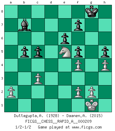 Last move : 1/2-1/2 2018 March 21 6:30:22 [Event "FICGS__CHESS__RAPID_A__000209"] [Site "FICGS"] [Date "2018.01.22"] [Round "1"] [White "Duttagupta,Aniruddha"] [Black "Daanen,Aard"] [Result "1/2-1/2"] [WhiteElo "1928"] [BlackElo "2015"] 1.d4 Nf6 2.Bg5 d5 3.e3 c5 4.Bxf6 gxf6 5.dxc5 Nc6 6.Bb5 e6 7.c4 dxc4 8.Nd2 Rg8 9.Bxc6+ bxc6 10.Qa4 Qd5 11.Ne2 Qxc5 12.O-O Rb8 13.Rfd1 Be7 14.Rab1 Kf8 15.Qc2 h5 16.h4 c3 17.bxc3 Rxb1 18.Rxb1 f5 19.Rb8 Kg7 20.Nf3 Bd6 21.Ra8 Qb6 22.Qb3 c5 23.Qxb6 axb6 24.Nf4 Bxf4 25.exf4 Bb7 26.Rxg8+ Kxg8 27.Ne5 b5 1/2-1/2 Trompowsky attack (Ruth, Opovcensky Opening) Kingside Castling by player White (move 12) This chess game ended in a draw. Follow this game move after move (download)In Chess, just as in life, today's bliss may be tomorrow's poison. (Assaic) In der Schule lernt man nichts. Es ist nur Zeitverschwendung. (Robert James Fischer) Nos gusta pensar. (Gary Kasparov) On n'a jamais que l'âge auquel on a commence à jouer aux échecs car après on cesse de vieillir. (Capablanca) You must do what you feel is right... of course. (Obi-Wan Kenobi in Star Wars ep.4)