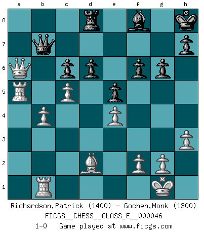 Last move : 1-0 2007 August 27 11:51:21 [Event "FICGS__CHESS__CLASS_E__000046"] [Site "FICGS"] [Date "2007.04.22"] [Round "1"] [White "Richardson,Patrick"] [Black "Gochen,Monk"] [Result "1-0"] [WhiteElo "1400"] [BlackElo "1300"] 1.e4 d6 2.d4 e6 3.Nf3 Nc6 4.Nc3 a6 5.Be2 Nge7 6.O-O e5 7.Bc4 f6 8.a3 b5 9.Ba2 g6 10.d5 Bg4 11.dxc6 Nxc6 12.h3 Bxf3 13.Qxf3 b4 14.Nd5 Bg7 15.Be3 Rb8 16.axb4 Nxb4 17.Nxb4 Rxb4 18.b3 O-O 19.c3 Rb7 20.b4 Kh8 21.Bd2 Qa8 22.Bd5 Qc8 23.Bxb7 Qxb7 24.Rfb1 Qb5 25.Ra5 Qb7 26.Qd3 Rd8 27.c4 Bf8 28.c5 c6 29.Qxa6 1-0 This chess game has been lost on time (started : 2007.04.22 6:24:37) King's pawn Opening Kingside Castling by player White (move 6) Kingside Castling by player Black (move 18) Player White won this chess game. Follow this game move after move (download)It is difficult to play against Einstein's theory --on his first loss to Fischer. (Mikhail Tal) Es ist nicht das erste mal, dass sich die FIDE dem Arabischen Geld gebeugt hat (über die FIDE WM 2004 in Lybien). (Larry Evans) Por la belleza de sus partidas, la claridad de su juego y lo brillante de sus ideas, Fischer se creó el mismo como un artista de la misma estatura como Brahms, Rembrandt y Shakespeare. (David Levy) Ce n'est pas pour s'amuser qu'il joue aux échecs : il célèbre un culte. (Vladimir Nabokov) Rules and bones are meant to be broken. (Anonymous)