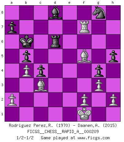 Last move : 1/2-1/2 2018 March 20 23:51:46 [Event "FICGS__CHESS__RAPID_A__000209"] [Site "FICGS"] [Date "2018.01.22"] [Round "1"] [White "Rodriguez Perez,Rene"] [Black "Daanen,Aard"] [Result "1/2-1/2"] [WhiteElo "1970"] [BlackElo "2015"] 1.e4 e5 2.Nf3 Nf6 3.Nxe5 d6 4.Nf3 Nxe4 5.d4 d5 6.Bd3 Nc6 7.O-O Be7 8.Re1 Bg4 9.c4 Nf6 10.Nc3 Bxf3 11.Qxf3 Nxd4 12.Qd1 dxc4 13.Bxc4 c5 14.Qa4+ Qd7 15.Qxd7+ Kxd7 16.Bxf7 Bd6 17.Rb1 Kc6 18.Bg5 Rad8 19.Ne2 Nxe2+ 20.Rxe2 b5 21.b3 Rhf8 22.Be6 h6 23.Bd2 Be5 24.Ba5 Bc7 25.Bc3 Rd3 26.Be1 Re8 27.g3 Rd6 28.Bg4 Rxe2 29.Bxe2 Re6 30.Bf3+ Kb6 31.Bc3 Re8 32.b4 c4 33.Bd4+ Ka6 34.Rd1 Re6 35.Kf1 Bb6 36.Bc3 g5 37.Bg2 Bc7 38.Bh3 g4 39.Bg2 h5 40.Rd2 Kb6 41.Re2 Rd6 42.Re7 Bd8 43.Rf7 Nd7 44.Be4 Nf6 45.Bf5 Ng8 46.Be4 Nf6 47.Bf5 Ng8 1/2-1/2 Petrov : Classical attack Kingside Castling by player White (move 7) This chess game ended in a draw. Follow this game move after move (download)Chess is in its essence a game, in its form an art, and in its execution a science. (Baron Tassilo) Fallen sollten polizeilich verboten werden. (Savielly Grigorievitsch Tartakower) Las Aperturas te enseñan aperturas. ¡Los Finales te enseñan Ajedrez!. (Stephan Gerzadowicz) Je menace de comprendre la position. (Anonyme) Life is the sum of all your choices. (Albert Camus)
