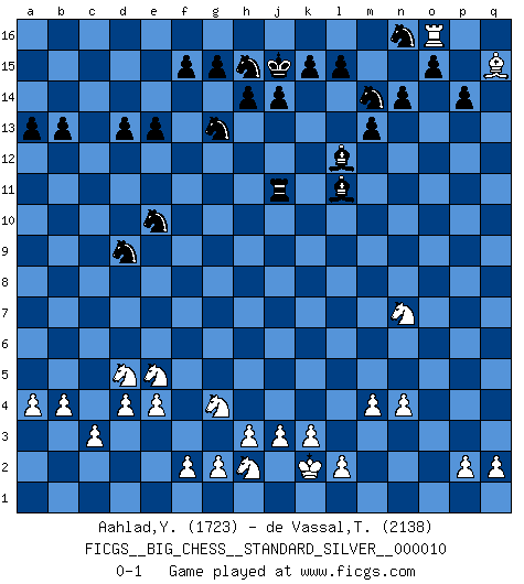 Last move : 0-1 2018 May 12 18:52:41 [Event "FICGS__BIG_CHESS__STANDARD_SILVER__000010"] [Site "FICGS"] [Date "2018.01.22"] [Round "1"] [White "Aahlad,Yeturu"] [Black "de Vassal,Thibault"] [Result "0-1"] [WhiteElo "1723"] [BlackElo "2138"] 1.j2-k4 h15-g13 2.h1-o7 m15-m13 3.o7-c7 j15-k13 4.c7-c15 h16-o10 5.h2-g4 o10-o2 6.m2-m4 o2-o10 7.p1-o3 l16-p12 8.k1-h2 e15-e13 9.c15-c12 p16-o14 10.l1-p5 k16-h15 11.b1-c3 b16-c14 12.e2-e4 g16-f14 13.f1-b5 n15-n14 14.d2-d4 d15-d13 15.c12-k5 f16-b12 16.g1-f3 o16-f8 17.c1-l9 c16-l8 18.n2-n4 m16-m14 19.k5-j4 j16-h16 20.o1-f9 m14-l14 21.j4-j7 o10-j10 22.j7-j10 l8-j10 23.m1-m3 c14-d12 24.o3-n5 a16-c16 25.q1-o1 c16-c9 26.o1-o10 j10-h9 27.n5-l6 f14-e12 28.j1-j2 e16-e14 29.o10-a10 a15-a13 30.e1-o1 e14-f14 31.f9-g10 h9-g10 32.b5-g10 l14-l9 33.o1-o8 l9-l10 34.g10-d7 l10-a10 35.d7-a10 e12-c11 36.a10-d7 d12-e10 37.a1-o1 q16-m16 38.o1-o7 m16-m14 39.m3-o3 m14-l14 40.o3-o5 f8-k12 41.o8-j8 k12-j13 42.p5-k10 j13-l11 43.k10-m8 l14-l12 44.f3-e5 f14-f8 45.o5-j5 f8-j8 46.j5-j8 c9-j9 47.j8-g8 p12-n10 48.o7-n7 l12-n12 49.d7-f5 n10-p8 50.k2-k3 n12-n7 51.l6-n7 p8-l12 52.g8-c8 h16-j15 53.a2-a4 b15-b13 54.b2-b4 c11-d9 55.c8-c16 b12-k4 56.j2-k2 k4-f8 57.c3-d5 f8-j11 58.m8-j11 j9-j11 59.c16-o16 k13-m14 60.c2-c3 o14-n16 61.f5-q15 p15-p14 0-1 Thibault de Vassal Thanks for the game! It is much more difficult to play you already, to be continued :) Yeturu Aahlad That means a lot, coming from you. Follow this game move after move (download)The defensive power of a pinned piece is only imaginary. (Aaron Nimzovich) Je mehr wir mit Computern analysieren, desto mehr glauben wir an Verteidigung. (Vladimir Kramnik) Personalmente, yo prefiero mirar hacia el futuro en donde un programa de computadora gane el título mundial de Ajedrez. La humanidad necesita una lección de humildad. (Richard Dawkings) Les Echecs mettent en conflit, non pas deux intelligences, mais deux volontés. (Lasker) Memory is a complicated thing, a relative to truth, but not its twin. (Barbara Kingsolver, Animal Dreams)