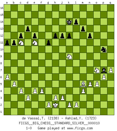 Last move : 1-0 2018 August 22 19:17:36 [Event "FICGS__BIG_CHESS__STANDARD_SILVER__000010"] [Site "FICGS"] [Date "2018.01.22"] [Round "2"] [White "de Vassal,Thibault"] [Black "Aahlad,Yeturu"] [Result "1-0"] [WhiteElo "2138"] [BlackElo "1723"] 1.j2-k4 m15-m13 2.h2-g4 j15-k13 3.h1-l4 e15-e13 4.m2-m4 l16-p12 5.l4-c12 h15-g13 6.c12-p12 p16-o14 7.p12-j6 b16-c14 8.e2-e4 h16-p9 9.b1-c3 n15-n13 10.f1-b5 k13-h12 11.p1-o3 f16-b12 12.l1-p5 h12-f11 13.g1-j2 o16-g9 14.n2-n3 k16-l14 15.d2-d3 d15-d13 16.c1-l9 c16-h11 17.b5-a6 g16-f14 18.l9-g13 f11-g13 19.p5-g13 h14-g13 20.j6-d11 j16-j15 21.d11-h11 j14-j13 22.h11-k13 g13-g12 23.e1-e3 e16-h16 24.e3-f3 h16-h12 25.m1-m3 h12-k12 26.k13-e8 m16-h16 27.f3-f9 h16-h9 28.k1-h2 q16-h16 29.m3-l3 h9-h8 30.e8-d9 h16-h9 31.l3-l5 o14-q13 32.l5-p5 p9-n9 33.a1-e1 g9-j11 34.d9-c9 j15-k14 35.p5-f5 k12-k9 36.e1-e3 h8-f8 37.f5-f8 j11-f8 38.f9-h9 k9-h9 39.c9-e11 a16-h16 40.e11-k11 l14-k12 41.k11-f15 h9-h15 42.f15-o7 o15-o14 43.o1-j6 p15-p14 44.o3-n5 l15-l14 45.q2-q4 k14-l15 46.j6-q13 p14-q13 47.o7-o14 n9-p11 48.p2-p4 h15-h10 49.o14-o15 l15-k14 50.o15-q13 h10-q10 51.q13-m9 q10-l10 52.h2-k3 n13-n12 53.e3-f3 h16-p16 54.j1-h2 p16-p13 55.m9-m12 l10-l13 56.m12-q16 p13-p16 57.q16-q15 l13-l8 58.q15-q13 l8-o8 59.o2-o4 c14-d12 60.q13-m9 k12-h13 61.c3-d5 p11-a11 62.f3-f6 f8-g7 63.f6-k6 k14-j14 64.b2-b4 g7-h8 65.k6-j6 b12-f8 66.q1-m1 k15-k13 67.m1-m3 j13-j12 68.m3-l3 h13-k12 69.a2-a4 d12-f11 70.k3-h4 f8-h10 71.a6-b5 e13-e12 72.h4-g6 h8-g9 73.g4-h6 a11-a9 74.j2-g3 g9-d6 75.m9-a9 d6-a9 76.l3-l9 a9-c11 77.l9-l6 c15-c13 78.l6-p6 p16-q16 79.p6-q6 q16-p16 80.j6-p6 p16-o16 81.q4-q5 c11-g7 82.p6-j6 f11-g9 83.g3-f5 g7-e9 84.f5-e7 e9-j13 85.h6-g8 h10-l7 86.f2-f4 k12-m11 87.b5-g10 o8-g8 88.e7-g8 j13-q6 89.j6-q6 l7-n9 90.q6-l6 j14-k14 91.p4-p5 b15-b14 92.g6-j7 a15-a13 93.q5-q6 g15-g14 94.l6-f6 o16-f16 95.n5-o7 n9-l11 96.f6-f5 b14-b13 97.g8-h10 g9-f11 98.h10-k9 l11-k12 99.a4-a5 a13-a12 100.b4-b5 a12-a11 101.a5-a6 f16-o16 102.p5-p6 o16-o10 103.g10-m5 b13-b12 104.n3-n4 c13-c12 105.q6-q7 m11-o12 106.o4-o5 o12-p10 107.c2-c4 b12-b11 108.k4-l6 o10-n10 109.l6-m8 n10-o10 110.f5-l5 f14-h13 111.l5-l10 o10-l10 112.m8-l10 k12-p7 113.n4-n5 f11-h12 114.l10-j11 g12-g11 115.d5-e7 k13-k12 116.j11-h13 g14-h13 117.e7-f9 h12-f13 118.j7-h9 h13-h12 119.h9-f8 f13-d14 120.f8-e10 d14-b13 121.f9-e11 b13-c11 122.e10-c11 1-0 Follow this game move after move (download)Life is like a game of Chess, changing with each move. (Chinese proverb) Als ich elf wurde, wurde ich einfach gut. (Robert James Fischer) Ciertamente el estado mental actual de Bobby Fischer es una tragedia. Uno de los mas grandes jugadores de Ajedrez del mundo -el orgullo y pena del Ajedrez Americano. (Frank Brady) Echiquier : carré parfait, comme la Jérusalem nouvelle décrite par l'auteur de l'Apocalypse, huit cases sur huit, exaltation du chiffre 4, symbole du cosmos aux quatre horizons... où le noir et le blanc, l'ombre et la lumière, le mal et le bien s'entremêlent et se conjuguent. (Robert Couffignal, Le Gambit du poète) Somehow our devils are never quite what we expect when we meet them face to face. (Nelson DeMille)