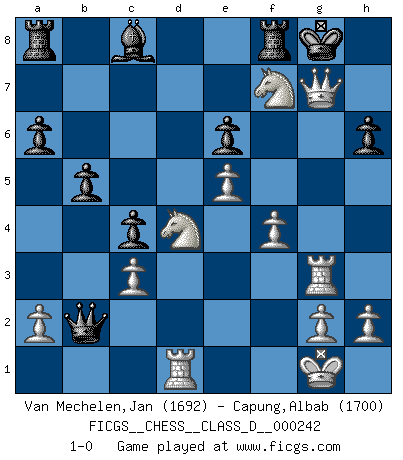 Last move : 1-0 2018 February 12 17:21:26 [Event "FICGS__CHESS__CLASS_D__000242"] [Site "FICGS"] [Date "2018.01.23"] [Round "1"] [White "Van Mechelen,Jan"] [Black "Capung,Albab"] [Result "1-0"] [WhiteElo "1692"] [BlackElo "1700"] 1.e4 e6 2.f4 Bc5 3.Nf3 Nf6 4.d4 Bb6 5.Bd3 Nc6 6.c3 O-O 7.Na3 a6 8.Nc2 Nh5 9.O-O d6 10.Be3 d5 11.e5 Na5 12.Ng5 h6 13.Qxh5 Nc4 14.Bxc4 dxc4 15.Ne4 c5 16.Rad1 cxd4 17.Bxd4 Bxd4+ 18.Nxd4 Qb6 19.Rf3 Kh8 20.Rg3 Qxb2 21.Nd6 b5 22.Nxf7+ Kh7 23.Qg6+ Kg8 24.Qxg7+ 1-0 French : Labourdonnais variation Kingside Castling by player Black (move 6) Kingside Castling by player White (move 9) Player White won this chess game. Follow this game move after move (download)Chess is a sea in which a gnat may drink and an elephant may bathe. (Hindu proverb) Im Leben werden Partien nie so unstrittig gewonnen wie im Spiel (Emanuel Lasker) No existe un remordimiento como el remordimiento del Ajedrez. (H. G. Wells) La solitude du joueur d'Echecs à l'approche du mat est semblable à celle du condamné. (Francis Szpiner) When you've done things right people won't know you've done anything at all. (Futurama)