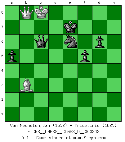 Last move : 0-1 2018 May 16 10:59:6 [Event "FICGS__CHESS__CLASS_D__000242"] [Site "FICGS"] [Date "2018.01.23"] [Round "1"] [White "Van Mechelen,Jan"] [Black "Price,Eric"] [Result "0-1"] [WhiteElo "1692"] [BlackElo "1629"] 1.e4 e5 2.Nf3 Nc6 3.Bc4 Nf6 4.d3 Be7 5.O-O O-O 6.Re1 d6 7.a4 Bg4 8.Be3 Re8 9.a5 a6 10.Nc3 Bf8 11.h3 Be6 12.Bg5 g6 13.Qd2 Bg7 14.Nd5 Bxd5 15.Bxd5 Qd7 16.Ba2 b6 17.axb6 cxb6 18.c3 Rad8 19.b4 a5 20.b5 Ne7 21.Bc4 Qc7 22.Bh6 d5 23.exd5 Nexd5 24.Bxg7 Kxg7 25.Qc2 Nf4 26.Re3 N6d5 27.R3e1 Qd7 28.Rad1 f6 29.Nh2 h5 30.Nf1 Qb7 31.f3 h4 32.Ne3 Ne7 33.d4 exd4 34.cxd4 Ned5 35.Nxd5 Rxe1+ 36.Rxe1 Nxd5 37.Qe4 Qd7 38.Bd3 f5 39.Qe5+ Kh6 40.Bc4 Nb4 41.d5 Qd6 42.Qxd6 Rxd6 43.f4 Kg7 44.Kf2 Kf6 45.Re2 Kf7 46.Ke3 Ke7 47.Kd4 Kd7 48.Re6 Nc2+ 49.Ke5 Rxe6+ 50.dxe6+ Ke7 51.Bb3 Ne3 52.Kd4 Nxg2 53.Kd5 Nxf4+ 54.Kc6 Nxh3 55.Kxb6 Nf4 56.Kc7 h3 57.b6 h2 58.b7 h1Q 59.b8Q Nxe6+ 60.Kc8 Qc6+ 0-1 Two knights defense (Modern Bishop's Opening) Kingside Castling by player White (move 5) Kingside Castling by player Black (move 5) 10 pieces endgame at move 55 : White KBPP , Black KNPPPP WHITE : King + 1 Bishop 2 Pawns BLACK : King + 1 Knight 4 Pawns Promotion Queen by player Black (move 58) Promotion Queen by player White (move 59) 9 pieces endgame at move 59 : White KQB , Black KQNPPP WHITE : King + 1 Queen 1 Bishop BLACK : King + 1 Queen 1 Knight 3 Pawns Player Black won this chess game. Follow this game move after move (download)Nonsense was the last thing Fischer was interested in, as far as Chess was concerned. (Elie Agur) Schach ist wie eine schöne Frau, zu der wir ständig zurückkehren, gleichviel, wie oft sie uns zurückweist. (Anonymous) El arma más poderosa en el Ajedrez, es tener la próxima movida. (David Bronstein) C'est la seule position que je connaisse où les deux camps sont mals. Propos prêtés à V. Anand. Do not put your faith in what statistics say until you have carefully considered what they do not say. (William W. Watt)