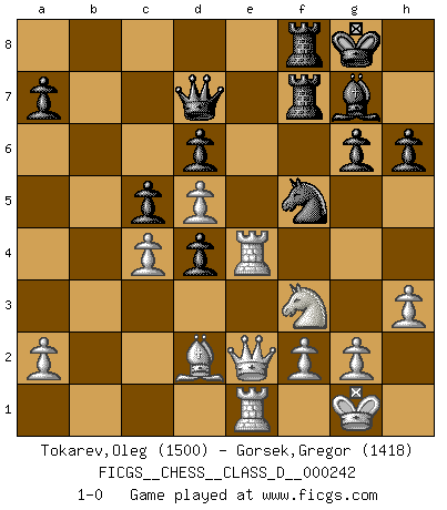 Last move : 1-0 2018 April 6 8:15:51 [Event "FICGS__CHESS__CLASS_D__000242"] [Site "FICGS"] [Date "2018.01.23"] [Round "1"] [White "Tokarev,Oleg"] [Black "Gorsek,Gregor"] [Result "1-0"] [WhiteElo "1500"] [BlackElo "1418"] 1.e4 g6 2.Nf3 Bg7 3.d4 d6 4.h3 Nc6 5.Bb5 Bd7 6.c4 e5 7.d5 Nd4 8.Nxd4 exd4 9.Bxd7+ Qxd7 10.O-O Ne7 11.Nd2 O-O 12.Nf3 c5 13.Bd2 b5 14.b3 h6 15.Rb1 f5 16.exf5 Rxf5 17.Re1 Raf8 18.Re6 R5f6 19.Re4 Nf5 20.Qe2 R6f7 21.Re1 bxc4 22.bxc4 1-0 Robatsch (Modern) defense Kingside Castling by player White (move 10) Kingside Castling by player Black (move 11) Player White won this chess game. Follow this game move after move (download)I have never in my life played the French Defence, which is the dullest of all openings. (Wilhelm Steinitz) Vom Schach wurde gesagt das Leben sei dafür nicht lange genug. Aber das ist der Fehler des Lebens, nicht des Schach'. (Irving Chernev) Botvinnik trataba de restarle el misterio al Ajedrez, siempre relacionandolo a situaciones de la vida ordinaria. El gustaba de llamar al Ajedrez un típico problema inexacto similar a aquellos de los cuales la gente siempre tiene que enfrentarse en la vida cotidiana. (Garry Kasparov) J'ai vu le vaincu d'Echecs jouer des années durant dans l'espoir de la fête de la victoire. Car tu es plus riche de ce qu'elle existe si même elle n'est point pour toi. Ainsi de la perle du fond des mers. (Antoine de Saint-Exupéry) The mind is like a parachute, it only functions when its open. (Unknown)
