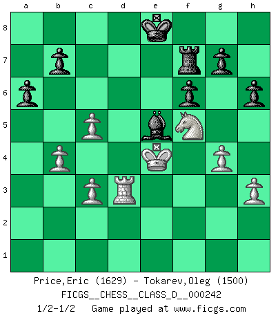 Last move : 1/2-1/2 2018 April 23 23:27:13 [Event "FICGS__CHESS__CLASS_D__000242"] [Site "FICGS"] [Date "2018.01.23"] [Round "1"] [White "Price,Eric"] [Black "Tokarev,Oleg"] [Result "1/2-1/2"] [WhiteElo "1629"] [BlackElo "1500"] 1.e4 c5 2.Nf3 a6 3.d4 cxd4 4.Nxd4 d6 5.Nc3 e6 6.Bc4 Be7 7.O-O Nf6 8.Bb3 O-O 9.f4 e5 10.fxe5 dxe5 11.Nf5 Bxf5 12.Qxd8 Rxd8 13.Rxf5 Nc6 14.Nd5 Bc5+ 15.Kf1 Nd4 16.Rg5 Nxe4 17.Rxe5 Re8 18.Bf4 Rxe5 19.Bxe5 Nxb3 20.axb3 Re8 21.Bc3 Nxc3 22.bxc3 h6 23.Ra5 Bd6 24.g3 Re5 25.c4 Kf8 26.Ra1 Bc5 27.b4 Bd6 28.c3 Ke8 29.Rd1 Bb8 30.c5 f6 31.g4 Re4 32.h3 Bg3 33.Kg2 Bb8 34.Kf3 Re5 35.Nf4 Re7 36.Ng6 Re6 37.Nh4 Be5 38.Rd3 Re7 39.Nf5 Rc7 40.Ke4 Rf7 1/2-1/2 Sicilian : O'Kelly variation Kingside Castling by player White (move 7) Kingside Castling by player Black (move 8) This chess game ended in a draw. Follow this game move after move (download)Of all my Russian books, the defense contains and diffuses the greatest 'warmth' which may seem odd seeing how supremely abstract Chess is supposed to be. (Vladimir Nabokov) Der Traum, für den ich lebe, ist der von einem freien Russland. Viele mögen sagen: Russland hat doch ein Parlament, einen gewählten Präsidenten. Aber ich spüre, dass in meiner Heimat die Angst wiederkehrt. Eine Angst, sich frei zu äußern, bestimmte Dinge zu tun (Garry Kasparov) El jugador táctico sabe que hacer cuando hay algo que hacer; mientras que el estratega sabe que hacer cuando no hay nada que hacer. (Gerald Abrahams) Les erreurs sont comme les malheurs, elles n'arrivent jamais seules. (Siegbert Tarrasch) The problem with troubleshooting is that trouble shoots back. (Anonymous)