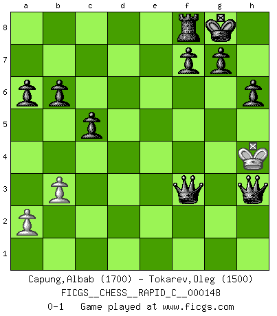 Last move : 0-1 2018 March 12 16:39:16 [Event "FICGS__CHESS__RAPID_C__000148"] [Site "FICGS"] [Date "2018.01.24"] [Round "1"] [White "Capung,Albab"] [Black "Tokarev,Oleg"] [Result "0-1"] [WhiteElo "1700"] [BlackElo "1500"] 1.e3 c5 2.Qf3 d5 3.Nc3 Nf6 4.Bb5+ Nc6 5.Nh3 e6 6.b3 Be7 7.Qg3 O-O 8.Bd3 e5 9.Bb2 a6 10.Ng5 h6 11.h4 e4 12.Ngxe4 dxe4 13.Be2 Bf5 14.d3 Bd6 15.f4 Nb4 16.O-O Nxc2 17.Rac1 exd3 18.Bf3 Rb8 19.e4 Ne3 20.Rf2 Bg4 21.e5 Nf5 22.Qh2 Bxf3 23.gxf3 Be7 24.exf6 Bxf6 25.Ne4 Bxb2 26.Rxb2 Qd4+ 27.Rf2 b6 28.Qh3 Ne3 29.Rd2 Nd5 30.Nf2 Nxf4 31.Qf1 Rbe8 32.Kh1 Ne2 33.Rxe2 dxe2 34.Qe1 Qxh4+ 35.Kg2 Re6 36.Rc4 Rg6+ 37.Rg4 Rxg4+ 38.Nxg4 Qxe1 39.Nf2 Qf1+ 40.Kg3 e1Q 41.Kh4 Qe1xf2+ 42.Kg4 Qxf3+ 43.Kh4 Qf1h3+ 0-1 Van't Kruijs Opening Kingside Castling by player Black (move 7) Kingside Castling by player White (move 16) Promotion Queen by player Black (move 40) Player Black won this chess game. Follow this game move after move (download)In the perfect Chess combination as in a first-rate short story, the whole plot and counter-plot should lead up to a striking finale, the interest not being allayed until the very last moment. (Yates and Winter) Ich verstehe den Grund nicht, warum die Aufteilung in Frauen und Männer überhaupt im Schach besteht. (Judith Polgar) No es tiempo de jugar al Ajedrez cuando la casa esta en llamas. (Proverbio Italiano) RxDa4 pat (...) Don't be discouraged. It's often the last key in the bunch that opens the lock. (Author unknown)