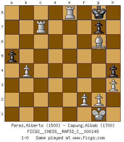 Last move : 1-0 2018 January 30 10:34:16 [Event "FICGS__CHESS__RAPID_C__000148"] [Site "FICGS"] [Date "2018.01.24"] [Round "1"] [White "Perez,Alberto"] [Black "Capung,Albab"] [Result "1-0"] [WhiteElo "1500"] [BlackElo "1700"] 1.e4 e6 2.d4 c5 3.c3 Qb6 4.Nf3 cxd4 5.cxd4 Bb4+ 6.Nc3 Nc6 7.Be2 Nf6 8.Qd3 Ng4 9.O-O e5 10.Nd5 Qa5 11.h3 Nf6 12.dxe5 Nxd5 13.exd5 Ne7 14.Rd1 O-O 15.Be3 Nxd5 16.Qxd5 Qxd5 17.Rxd5 b6 18.Rc1 h6 19.a3 Be7 20.Nd4 Bb7 21.Rxd7 Bc5 22.Rxb7 Rfe8 23.b4 Bxd4 24.Bxd4 Rad8 25.Bb5 Re6 26.Rd7 Ra8 27.R1c7 a6 28.Bc5 bxc5 29.Bc4 Rg6 30.Bxf7 Kh8 31.Bxg6 cxb4 32.axb4 Rg8 33.e6 h5 34.e7 h4 35.Rd8 a5 36.Rxg8 Kxg8 37.e8=R 1-0 French defense Kingside Castling by player White (move 9) Kingside Castling by player Black (move 14) Promotion Rook by player White (move 37) Player White won this chess game. Follow this game move after move (download)A Chess game is divided into three stages: the first, when you hope you have the advantage, the second when you believe you have an advantage, and the third... when you know you're going to lose ! (Savielly Tartakower) Ich verachte die Medien. (Robert James Fischer) Existen dos clases de sacrificios: los correctos y los míos. (Mikhail Tal) L'attaque fait le spectacle, la défense gagne les matchs. (Dicton footballistique) The various flowers seem good to different people. (Chinese proverb)
