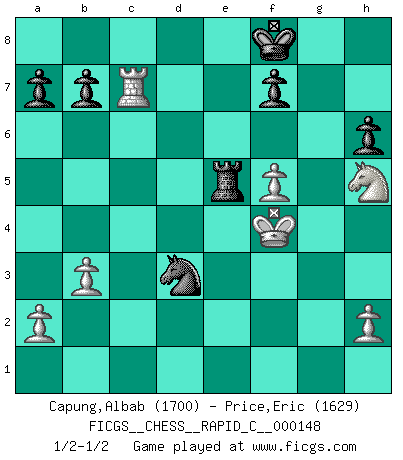 Last move : 1/2-1/2 2018 February 27 19:43:53 [Event "FICGS__CHESS__RAPID_C__000148"] [Site "FICGS"] [Date "2018.01.24"] [Round "1"] [White "Capung,Albab"] [Black "Price,Eric"] [Result "1/2-1/2"] [WhiteElo "1700"] [BlackElo "1629"] 1.e3 d5 2.c4 e6 3.Qf3 Nf6 4.cxd5 exd5 5.b3 Bg4 6.Qg3 Bd6 7.Qh4 O-O 8.Bb2 Nbd7 9.Bd3 Bh5 10.Nh3 Ne5 11.Bf5 Bg6 12.Bxg6 Nxg6 13.Bxf6 Qxf6 14.Qxf6 gxf6 15.Nc3 c6 16.O-O h6 17.e4 Be5 18.exd5 cxd5 19.Rad1 d4 20.Nd5 Rfc8 21.f4 Bd6 22.Nxf6+ Kh8 23.f5 Nf8 24.g4 d3 25.Rf3 Bc5+ 26.Kh1 Rd8 27.g5 Kg7 28.Nh5+ Kh7 29.g6+ Kg8 30.g7 Nh7 31.Rc1 Bb4 32.N3f4 Bxd2 33.Rd1 Ng5 34.Rxd3 Rxd3 35.Nxd3 Ne4 36.Kg2 Bc3 37.Ndf4 Bxg7 38.Nxg7 Kxg7 39.Nh5+ Kf8 40.Kf3 Re8 41.Rd7 Nc5 42.Rc7 Re5 43.Kf4 Nd3+ 44.Kg4 Nf2+ 45.Kf4 Nd3+ 46.Kg4 Nf2+ 47.Kf4 Nd3+ 1/2-1/2 Van't Kruijs Opening Kingside Castling by player Black (move 7) Kingside Castling by player White (move 16) This chess game ended in a draw. Follow this game move after move (download)I am the best player in the world and I am here to prove it. (Bobby Fischer) Besser ein falscher Plan, logisch durchgeführt, als gar kein Plan. (Viktor Kortschnoi) La única cosa que los jugadores de Ajedrez tienen en común, es el Ajedrez. (Lodewijk Prins) Avant la finale, les dieux ont créé le milieu de partie. (Tarrasch) There is a great deal of difference between an eager man who wants to read a book and a tired man who wants a book to read. (G.K. Chesterton)