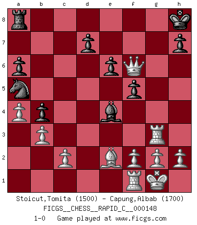 Last move : 1-0 2018 February 7 22:11:41 [Event "FICGS__CHESS__RAPID_C__000148"] [Site "FICGS"] [Date "2018.01.24"] [Round "1"] [White "Stoicut,Tomita"] [Black "Capung,Albab"] [Result "1-0"] [WhiteElo "1500"] [BlackElo "1700"] 1.b3 e6 2.Bb2 c5 3.e3 a6 4.Nf3 Nf6 5.d4 cxd4 6.Bxd4 Nc6 7.Bb2 b5 8.Be2 Bb7 9.O-O Bd6 10.Qxd6 Ne4 11.Qf4 Nf6 12.Bxf6 gxf6 13.Nbd2 f5 14.a4 b4 15.Nc4 O-O 16.Nd6 Na5 17.Ne5 Qf6 18.Rad1 Bc6 19.e4 Qe7 20.Rd3 Bxe4 21.Rg3+ Kh8 22.Nexf7+ Rxf7 23.Nxf7+ Qxf7 24.Qe5+ Qf6 25.Qxf6+ 1-0 Nimzovich-Larsen attack Kingside Castling by player White (move 9) Kingside Castling by player Black (move 15) Player White won this chess game. Follow this game move after move (download)It began to feel as though you were playing against Chess itself. - On playing against Robert Fischer. (Walter Shipman) Ohne ihre Erfolge schmälern zu wollen würde ich sagen Petrosian, Spassky und Karpov verdanken ihre Siege ihren Trainern - Boleslavsky, Bondarevsky und Furman. (Mikhail Moiseyevich Botvinik) El ganador de una partida es aquel jugador que hace el penúltimo error. (Savielly Tartakover) L'ordinateur a tué l'originalité. Il n'y a plus guère d'aventures sur l'échiquier. (Jacob Murray) Secret operations are essential in war; upon them the army relies to make its every move. (Sun Tzu)