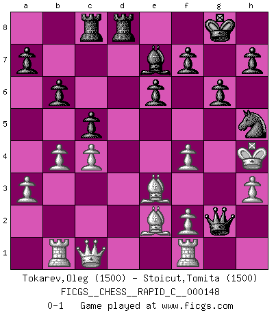 Last move : 0-1 2018 May 3 10:33:30 [Event "FICGS__CHESS__RAPID_C__000148"] [Site "FICGS"] [Date "2018.01.24"] [Round "1"] [White "Tokarev,Oleg"] [Black "Stoicut,Tomita"] [Result "0-1"] [WhiteElo "1500"] [BlackElo "1500"] 1.e4 b6 2.d4 e6 3.Nf3 Bb7 4.Nbd2 Nf6 5.Be2 Nxe4 6.O-O Nxd2 7.Bxd2 d6 8.c4 Be7 9.a3 O-O 10.Qc2 Nd7 11.b4 c5 12.Be3 Qc7 13.dxc5 dxc5 14.Rab1 Nf6 15.h3 Be4 16.Bd3 Bxf3 17.gxf3 g6 18.Kg2 Nd7 19.f4 Nf6 20.Be4 Rac8 21.Bd3 Nh5 22.Kf3 Bd6 23.Qc1 Rfd8 24.Be2 Qb7+ 25.Kg4 Qg2+ 26.Kh4 Be7+ 0-1 This chess game has been lost on time (started : 2018.01.24 4:51:16) Owen defense Kingside Castling by player White (move 6) Kingside Castling by player Black (move 9) Player Black won this chess game. Follow this game move after move (download)In Chess, at least, the brave inherit the earth. (Edmar Mednis) Je älter ich werde, um so mehr schätze ich die Bauern. (Paul Keres) El poder defensivo de una pieza clavada, solamente es imaginario. (Aaron Nimzovich) Les Echecs, c'est l'art de la guerre sans les charniers, c'est la résurrection des morts tombés au champ d'honneur, l'espoir perpétuel, la suprématie de l'intelligence sur la force, la culture de l'esprit. (F. Szpiner) Life is like internet, nothing interesting, but noone want to leave it. (Ilmars Cirulis)
