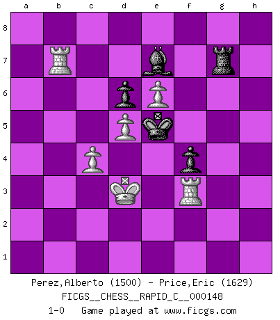 Last move : 1-0 2018 March 13 15:31:8 [Event "FICGS__CHESS__RAPID_C__000148"] [Site "FICGS"] [Date "2018.01.24"] [Round "1"] [White "Perez,Alberto"] [Black "Price,Eric"] [Result "1-0"] [WhiteElo "1500"] [BlackElo "1629"] 1.d4 Nf6 2.c4 e6 3.Nc3 Bb4 4.Nf3 c5 5.d5 d6 6.Bg5 h6 7.Bxf6 Qxf6 8.Qc2 exd5 9.cxd5 O-O 10.e4 Bg4 11.Nd2 Nd7 12.f3 Bh5 13.Bb5 Ne5 14.O-O Qf4 15.Rae1 a6 16.g3 Qf6 17.Be2 Rac8 18.a3 Ba5 19.f4 Ng4 20.Bxg4 Bxg4 21.e5 Qd8 22.Qe4 f5 23.Qd3 b5 24.e6 Qe7 25.Nf3 Bb6 26.Kg2 g5 27.Qd2 Bxf3+ 28.Rxf3 g4 29.R3f1 Kg7 30.h3 gxh3+ 31.Kxh3 h5 32.Rf3 Rh8 33.Nd1 h4 34.Qc3 Kg6 35.Kg2 Rcg8 36.Nf2 Qf6 37.gxh4 Qxc3 38.bxc3 c4 39.Rg3 Kf6 40.Nh3 Re8 41.a4 Rxh4 42.axb5 axb5 43.Rb1 Ra8 44.Rxb5 Ra2+ 45.Kf3 Bd8 46.Rb7 Be7 47.Rc7 Rh2 48.Ng1 Rd2 49.Nh3 Rh2 50.Nf2 Rxf4+ 51.Kxf4 Rxf2+ 52.Ke3 Rf1 53.Rxc4 Ke5 54.Ke2 Rh1 55.Rc7 f4 56.Rf3 Rh2+ 57.Kd3 Rh7 58.c4 Rg7 59.Rb7 1-0 Nimzo-Indian : Three knights, Korchnoi variation Kingside Castling by player Black (move 9) Kingside Castling by player White (move 14) Player White won this chess game. Follow this game move after move (download)Bobby Fischer is the greatest Chess player who has ever lived. (Ken Smith) Wenn ein Kopf und ein Buch zusammenstoßen und es klingt hohl, ist es denn allemal im Buche? (Georg Christoph Lichtenberg) Los errores estan ahí, esperando a que se cometan. (Savielly Tartakower) Toutes choses étant égales, c'est la conviction qui gagne. Alliée à une volonté de vaincre, elle sert de détonateur, suscite des idées, disperse les doutes et aide à penser clairement. (Robert Fischer) The Internet is the first thing that humanity has build that humanity doesn't understand, the largest experiment in anarchy that we have ever had. (Eric Schmidt)
