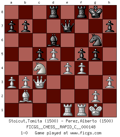 Last move : 1-0 2018 March 5 7:44:43 [Event "FICGS__CHESS__RAPID_C__000148"] [Site "FICGS"] [Date "2018.01.24"] [Round "1"] [White "Stoicut,Tomita"] [Black "Perez,Alberto"] [Result "1-0"] [WhiteElo "1500"] [BlackElo "1500"] 1.b3 e5 2.Bb2 Nc6 3.e3 d5 4.Nf3 Bg4 5.Be2 Bd6 6.O-O Nge7 7.d3 O-O 8.Nbd2 f5 9.h3 Bh5 10.Rc1 Ng6 11.c4 Nb4 12.a3 Nxd3 13.Bxd3 e4 14.Be2 exf3 15.Nxf3 c6 16.cxd5 c5 17.Nd2 Bxe2 18.Qxe2 Rc8 19.Qd3 Nh4 20.f4 g5 21.Qc3 Qe7 22.Nc4 Rcd8 23.Rce1 Ng6 24.e4 1-0 Nimzovich-Larsen attack : Modern variation Kingside Castling by player White (move 6) Kingside Castling by player Black (move 7) Player White won this chess game. Follow this game move after move (download)The hallmark of the artist is simplicity. (Larry Evans) Ein Gewinn durch eine ungenaue Kombination, sei sie auch noch so vorzeigbar, erfüllt mich mit Schaudern. (Wilhelm Steinitz) El Ajedrez es un juego terrible. Si no dominas el centro, tu oponente tiene una posición mas libre. Si tu tienes el centro, entonces realmente tienes algo de que preocuparte. (Siegbert Tarrasch) Je menace de comprendre la position. (Anonyme) Over-the-board chess is the favorite of mortals, correspondence chess is the favorite of the gods. (Eduard Dyckhoff)
