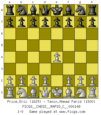 Last move : 1-0 2018 February 23 15:3:52 [Event "FICGS__CHESS__RAPID_C__000148"] [Site "FICGS"] [Date "2018.01.24"] [Round "1"] [White "Price,Eric"] [Black "Tanin,Ahmad Farid"] [Result "1-0"] [WhiteElo "1629"] [BlackElo "1500"] 1.e4 1-0 This chess game has been lost on time (started : 2018.01.24 4:51:16) King's pawn Opening Player White won this chess game. Follow this game move after move (download)Chess is the art which expresses the science of logic. (Mikhail Botvinnik) Das Spiel gibt uns die Genugtuung, die das Leben uns versagt. (Emanuel Lasker) Por esta medida (el intervalo entre Fischer y sus contemporaneos), yo le considero el mas grande campeón mundial. (Garry Kasparov) L'action d'une oeuvre littéraire se déroule sur un champ de bataille. Les masques et les types du drame moderne correspondent aux pièces du jeu d'échecs. L'intrigue correspond aux coups et aux gambits, c'est à dire aux techniques du jeu telles qu'utilisées et interprétées par les joueurs. Les tactiques et les péripéties [mouvements] correspondent aux coups exécutés par l'adversaire. (Viktor Shklovsky) Quotation,n.: The act of repeating erroneously the words of another. The words erroneously repeated. (Ambrose Bierce, The Devil's Dictionary)