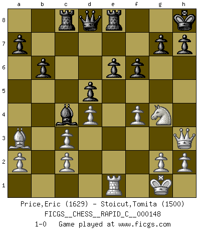 Last move : 1-0 2018 April 19 9:17:18 [Event "FICGS__CHESS__RAPID_C__000148"] [Site "FICGS"] [Date "2018.01.24"] [Round "1"] [White "Price,Eric"] [Black "Stoicut,Tomita"] [Result "1-0"] [WhiteElo "1629"] [BlackElo "1500"] 1.e4 b6 2.d4 Bb7 3.Nc3 e6 4.Nf3 Nf6 5.Bd3 Bb4 6.e5 Ne4 7.Bxe4 Bxc3+ 8.bxc3 Bxe4 9.O-O O-O 10.Qe2 Bb7 11.Ba3 d6 12.Qe3 Re8 13.exd6 cxd6 14.Rfe1 Nc6 15.Qf4 d5 16.Re5 Nxe5 17.Nxe5 f6 18.Ng4 Rc8 19.Qg3 Kh8 20.f4 Ba6 21.Re1 Bc4 22.Qh3 1-0 This chess game has been lost on time (started : 2018.01.24 4:51:16) Owen defense Kingside Castling by player White (move 9) Kingside Castling by player Black (move 9) Player White won this chess game. Follow this game move after move (download)I give 98 percent of my mental energy to Chess. Others give only 2 percent. (Bobby Fischer) Alles was am Schachbrett zählt sind gute Züge. (Robert James Fischer) Bobby solo arroja las piezas y solas caen en las casillas correctas. (Miguel Najdorf ) Les erreurs sont comme les malheurs, elles n'arrivent jamais seules. (Siegbert Tarrasch) Political correctness is subjecting us to gross incompetence. (Johann Piek)