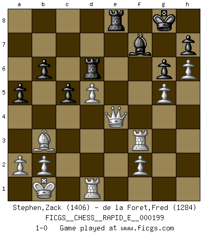 Last move : 1-0 2018 March 7 20:13:57 [Event "FICGS__CHESS__RAPID_E__000199"] [Site "FICGS"] [Date "2018.01.25"] [Round "1"] [White "Stephen,Zack"] [Black "de la Foret,Fred"] [Result "1-0"] [WhiteElo "1406"] [BlackElo "1284"] 1.d4 f5 2.Bg5 Nf6 3.Bxf6 exf6 4.e3 d5 5.c4 Be6 6.cxd5 Bb4+ 7.Nc3 Bxd5 8.Nge2 Bf7 9.Qc2 g6 10.h4 Nc6 11.h5 O-O 12.O-O-O Bxc3 13.Nxc3 Nb4 14.Qa4 Qd6 15.d5 Kg7 16.Bc4 Qc5 17.h6+ Kg8 18.Bb3 Qb6 19.e4 fxe4 20.Nxe4 Rad8 21.Nxf6+ Qxf6 22.Qxb4 b6 23.Rh3 Rd6 24.Qd2 a5 25.Rf3 Qh4 26.Kb1 c5 27.g4 Re8 28.Qf4 Qe7 29.g5 Qe4+ 30.Qxe4 1-0 Dutch, 2.Bg5 variation Kingside Castling by player Black (move 11) Queenside Castling by player White (move 12) Player White won this chess game. Follow this game move after move (download)I'd rather have a Pawn than a finger. (Reuben Fine) Ich war zu klein für die Schach-Schülermannschaft! (Woody Allen) No soy una persona materialista y por eso, no resiento la falta o pérdida del dinero. La ausencia de cosas mundanas carece de importancia. Ya que el Ajedrez es una forma en la que puedo ser tan materialista como yo desee sin tener la necesidad de vender mi alma. (Jamie Walter Adams) Les échecs sont utiles à l'exercice de la faculté de penser et à celle de l'imagination. Car nous devons posséder une méthode élaborée pour atteindre des buts partout où nous devons conduire notre raison. (Leibnitz) The next best thing to gambling and winning is gambling and loosing. (Nick Dandalos)