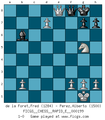 Last move : 1-0 2018 March 5 6:59:38 [Event "FICGS__CHESS__RAPID_E__000199"] [Site "FICGS"] [Date "2018.01.25"] [Round "1"] [White "de la Foret,Fred"] [Black "Perez,Alberto"] [Result "1-0"] [WhiteElo "1284"] [BlackElo "1500"] 1.e4 c5 2.d4 cxd4 3.c3 dxc3 4.Nxc3 Nc6 5.Nf3 d6 6.Bc4 e6 7.O-O Be7 8.Qe2 Bd7 9.a3 Nf6 10.Rd1 Rc8 11.Nb5 Na5 12.Ba2 Qb6 13.a4 a6 14.Be3 Bxb5 15.Qe1 Qd8 16.axb5 Nc4 17.bxa6 bxa6 18.Bg5 O-O 19.Bxf6 Bxf6 20.Bxc4 Rxc4 21.e5 Be7 22.exd6 Bf6 23.Rxa6 Qc8 24.Rb6 Bd8 25.d7 Qa8 26.Rxe6 fxe6 27.Qxe6+ Kh8 28.Qxc4 Qa5 29.Re1 Qf5 30.Re8 Qb1 31.Qf1 Qf5 32.Qe1 Kg8 33.Rxf8+ Qxf8 34.Qe8 Bb6 35.Ng5 1-0 Sicilian : Smith-Morra gambit Kingside Castling by player White (move 7) Kingside Castling by player Black (move 18) Player White won this chess game. Follow this game move after move (download)On the chessboard, lies and hypocrisy do not survive long. (Emanuel Lasker) Wir können eben der zündenden Macht des Opfers nicht wiederstehen, denn die Begeisterung für das Opfer liegt in der Natur des Menschen. (Rudolf Spielmann) A la fecha, Fischer esta simplemente un nivel arriba de todos los mejores jugadores de Ajedrez del mundo. (John Jacobs) Toute estimation doit être constamment réévaluée. (Jacob Estrin) God is an atheist. (Unknown)