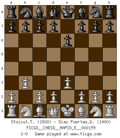 Last move : 1-0 2018 March 7 16:46:40 [Event "FICGS__CHESS__RAPID_E__000199"] [Site "FICGS"] [Date "2018.01.25"] [Round "1"] [White "Stoicut,Tomita"] [Black "Diaz Puertas,Guillermo"] [Result "1-0"] [WhiteElo "1500"] [BlackElo "1400"] 1.b3 e6 2.e3 1-0 This chess game has been lost on time (started : 2018.01.25 16:44:12) Nimzovich-Larsen attack Player White won this chess game. Follow this game move after move (download)A good sacrifice is one that is not necessarily sound but leaves your opponent dazed and confused. (Rudolph Spielmann) Frage des Reporters: -Worin besteht das Ziel von Gambiteröffnungen? Antwort: -Auf Kosten der Partie einen Ruf als Angriffspieler zu erwerben.- (Siegbert Tarrasch) Un jugador que es sorprendido, esta derrotado a medias. (Proverbio) La guerre est enfant de la passion, la passion est enfant du narcissisme et le narcissisme est l'enfant. (...) Une autre partie ? (Thibault de Vassal) They say poker is a zero-sum game. It must be, because every time I play my sum ends up zero. (Max Shapiro)