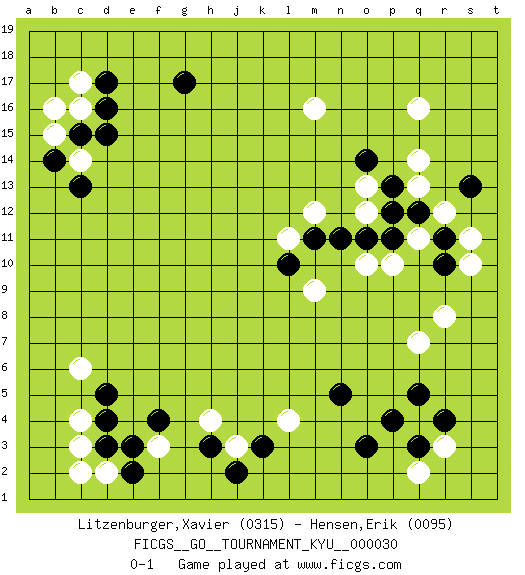 Last move : 0-1 2007 July 30 13:24:4 [Event "FICGS__GO__TOURNAMENT_KYU__000030"] [Site "FICGS"] [Date "2007.04.22"] [Round "1"] [Black "Litzenburger,Xavier"] [White "Hensen,Erik"] [Result "0-1"] [Rating 1 "0315"] [Rating 2 "0095"] 1.d16 q16 2.d4 q4 3.o3 l4 4.n5 q7 5.r4 q2 6.q5 f3 7.h3 r3 8.p4 c3 9.d3 c4 10.d5 d2 11.e2 c2 12.e3 c6 13.f4 q13 14.q3 m16 15.g17 j3 16.j2 p10 17.r10 h4 18.k3 c17 19.d17 c16 20.c15 b15 21.b14 c14 22.d15 b16 23.c13 r8 24.s13 s11 25.r11 s10 26.p11 o12 27.p12 o13 28.p13 q14 29.o11 o10 30.n11 m9 31.o14 m12 32.m11 l11 33.l10 q11 34.q12 r12 0-1 This go game has been lost on time (started : 2007.04.22 20:7:14) Here are the names of the openings (joseki) played in the four corners : Corner q4 : q4 o3 Hoshi (Hwajeom, Seongjeom, Xingwei`) 4-4 Point. The star or hoshi (4-4) point, emphasizing influence at the potential expense of territory. Ikken Kakari (Hankan Keolch'im, Yi Gua`jiao~, 1-Space Low Approach). Black 2 is the standard approach move to the 4-4. Corner d4 : d4 f3 Hoshi (Hwajeom, Seongjeom, Xingwei`) 4-4 Point. The star or hoshi (4-4) point, emphasizing influence at the potential expense of territory. Ikken Kakari (Hankan Keolch'im, Yi Gua`jiao~, 1-Space Low Approach). White 2 is the standard approach move to the 4-4. Player White won this Go (weiqi, baduk) game. Follow this game move after move (download)Balance is not what players strike for, and if it does arise, it is in spite of them. (Pierre Audouard) Methinks King Thibault should dub Marius Zubac a knight of the square board... I mean table, henceforth addressing him as Sir Marius, and bestow on him a suitable land from the kingdom of FICGS & marry him off to a worthy, fair maiden, lest he slice our heads with his mighty sword in his wrath. (Dinesh De Silva)