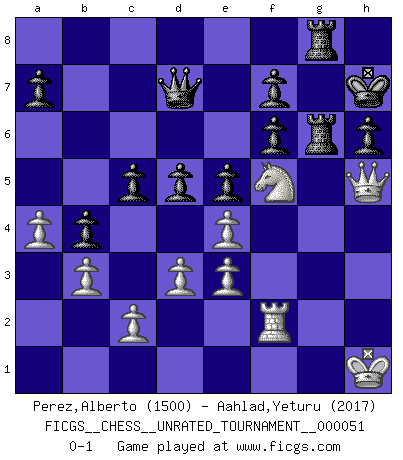 Last move : 0-1 2018 June 14 21:40:47 [Event "FICGS__CHESS__UNRATED_TOURNAMENT__000051"] [Site "FICGS"] [Date "2018.01.26"] [Round "1"] [White "Perez,Alberto"] [Black "Aahlad,Yeturu"] [Result "0-1"] [WhiteElo "1500"] [BlackElo "2017"] 1.e4 e5 2.Nf3 Nc6 3.Bc4 Bc5 4.O-O d6 5.h3 Nf6 6.d3 O-O 7.Be3 Bxe3 8.fxe3 Na5 9.Nbd2 Nxc4 10.Nxc4 b5 11.Ncd2 c5 12.a4 b4 13.Qe2 Be6 14.b3 h6 15.Rad1 Qc7 16.Nh4 Kh7 17.Rxf6 gxf6 18.Qh5 Rg8 19.Ndf3 Bxh3 20.Nf5 Rxg2+ 21.Kh1 Bxf5 22.Qxf5 Rg6 23.Nh4 Kg7 24.Rf1 Rf8 25.Qh5 Qd7 26.Nf5 Kh7 27.Rf3 Rfg8 28.Rf2 d5 0-1 Giuoco Piano Kingside Castling by player White (move 4) Kingside Castling by player Black (move 6) Player Black won this chess game. Follow this game move after move (download)Chess is a fighting game which is purely intellectual and includes chance. (Richard Reti) Im Leben werden Partien nie so unstrittig gewonnen wie im Spiel (Emanuel Lasker) Te sientas frente a un tablero y repentinamente tu corazón brinca. Tu mano tiembla al tomar una pieza y moverla. Pero lo que el Ajedrez te enseña es que tu debes permanecer ahí con calma y pensar de que si realmente es una buena idea o de que si hay otras ideas mejores. (Stanley Kubrick) L'ordinateur a tué l'originalité. Il n'y a plus guère d'aventures sur l'échiquier. (Jacob Murray) I can't decide which is riskier; taking crazy risks, or taking advice on crazy risks from a crazy risk taker. (Gregory House in House M.D.)