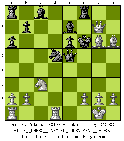 Last move : 1-0 2018 June 14 21:3:5 [Event "FICGS__CHESS__UNRATED_TOURNAMENT__000051"] [Site "FICGS"] [Date "2018.01.26"] [Round "1"] [White "Aahlad,Yeturu"] [Black "Tokarev,Oleg"] [Result "1-0"] [WhiteElo "2017"] [BlackElo "1500"] 1.e4 c5 2.c3 a6 3.d4 cxd4 4.cxd4 d6 5.Nf3 e6 6.Nc3 Be7 7.Bd3 Nf6 8.O-O O-O 9.e5 dxe5 10.dxe5 Nd5 11.Qc2 h6 12.Rd1 Nc6 13.Qe2 Qc7 14.Qe4 f5 15.exf6 Nxf6 16.Qg6 Ne5 17.Nxe5 Qxe5 18.Bxh6 Nd5 19.Qh7+ Kf7 20.Bg6+ Kf6 21.Qxg7+ 1-0 Sicilian : Alapin's variation (2.c3) Kingside Castling by player White (move 8) Kingside Castling by player Black (move 8) Player White won this chess game. Follow this game move after move (download)I play correspondence chess because it is both art and science while chess is art only. (A player at FICGS) Die jungen Leute sollen verstehen, dass sie noch etwas von mir lernen können und müssen. (Viktor Kortschnoi) En manos de Fischer's, una diminuta ventaja teórica es tan buena como tener una Reina de ventaja. (Isaac Kashdan) Il vaut toujours mieux jouer un plan faux de façon logique que de n'avoir pas de plan du tout. (Victor Kortchnoï) Mac users swear by their computers. PC users swear at their computers. (Author unknown)