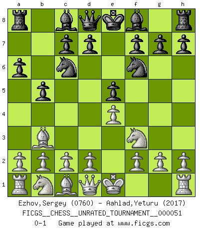 Last move : 0-1 2018 March 28 7:27:35 [Event "FICGS__CHESS__UNRATED_TOURNAMENT__000051"] [Site "FICGS"] [Date "2018.01.26"] [Round "1"] [White "Ezhov,Sergey"] [Black "Aahlad,Yeturu"] [Result "0-1"] [WhiteElo "0760"] [BlackElo "2017"] 1.e4 e5 2.Nf3 Nc6 3.Bb5 a6 4.Ba4 b5 5.Bb3 Nf6 0-1 This chess game has been lost on time (started : 2018.01.26 10:57:54) Ruy Lopez : Caro variation Player Black won this chess game. Follow this game move after move (download)Nonsense was the last thing Fischer was interested in, as far as Chess was concerned. (Elie Agur) Gegen einen Schachcomputer zu verlieren ist wie Löcher in den Strümpfen zuhaben. Es ist nicht peinlich, solange man der einzige ist der es weiß. (Anonymous) El Ajedrez no es como la vida... ¡tiene reglas!. (Mark Pasternak) Je fais ceci parce que dans cinquante coups j'obtiendrai cela; je m'appelle Mikhail Moisevitch Botvinnik. (Botvinnik) Watch your thoughts; they become words. Watch your words; they become actions. Watch your actions; they become habits. Watch your habits; they become character. Watch your character; it becomes your destiny. (Frank Outlaw)