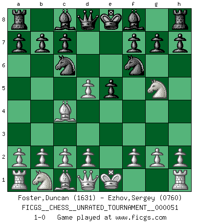 Last move : 1-0 2018 March 13 17:8:37 [Event "FICGS__CHESS__UNRATED_TOURNAMENT__000051"] [Site "FICGS"] [Date "2018.01.26"] [Round "1"] [White "Foster,Duncan"] [Black "Ezhov,Sergey"] [Result "1-0"] [WhiteElo "1631"] [BlackElo "0760"] 1.e4 e5 2.Nf3 Nc6 3.Bc4 Nf6 4.Ng5 d5 5.exd5 1-0 This chess game has been lost on time (started : 2018.01.26 10:57:54) Two knights defense Player White won this chess game. Follow this game move after move (download)Chess opens and enriches your mind. (Saudin Robovic) Ich kämpfe solange mein Gegner einen Fehler machen kann. (Emanuel Lasker) Solo existe una cosa que Fischer hace en el Ajedrez sin placer: ¡perder!. (Boris Spassky) Si le désir cupide (et stupide) de gagner est une inépuisable source de souffrance, une combinaison brillante sur l'échiquier est une découverte : le coquelicot qui s'épanouit lorsque apparaît la Voie Lactée. (Arrabal) The various flowers seem good to different people. (Chinese proverb)