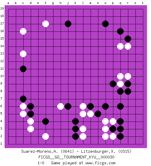 Last move : 1-0 2007 July 30 7:23:51 [Event "FICGS__GO__TOURNAMENT_KYU__000030 "] [Site "FICGS"] [Date "2007.04.22"] [Round "1"] [Black "Suarez-Moreno,Alejandro "] [White "Litzenburger,Xavier "] [Result "1-0"] [Rating 1 "0641"] [Rating 2 "0315"] 1.q16 c16 2.q4 d3 3.d5 c5 4.c7 c6 5.d6 d4 6.c11 f17 7.f4 o3 8.p3 o4 9.k4 l3 10.k3 l2 11.k2 p2 12.q2 p4 13.q3 o2 14.q6 r14 15.r15 q14 16.o17 r10 17.r9 q9 18.r8 f2 19.j17 c13 20.o6 m5 21.n5 l5 22.m6 l6 23.p9 q10 24.q8 h6 25.j6 1-0 This go game has been lost on time (started : 2007.04.22 20:7:14) Here are the names of the openings (joseki) played in the four corners : Corner d4 : d3 d5Komoku (Somok, Xiao~mu`) 3-4 Point. The komoku (3-4) point is the traditional corner enclosure move..Ikken Takagakari (Hankan Nop'dakeolch'im, Yi Gaogua`jiao~, 1-Space High Approach). The 5-4 approach move has become more popular in modern times, as modern Go emphasizes speed and influence. Corner d16 : c16 c11Komoku (Somok, Xiao~mu`) 3-4 Point. The komoku (3-4) point is the traditional corner enclosure move.. Corner q4 : q4 o3Hoshi (Hwajeom, Seongjeom, Xingwei`) 4-4 Point. The star or hoshi (4-4) point, emphasizing influence at the potential expense of territory.Ikken Kakari (Hankan Keolch'im, Yi Gua`jiao~, 1-Space Low Approach). White 2 is the standard approach move to the 4-4. Corner q16 : q16 r14Hoshi (Hwajeom, Seongjeom, Xingwei`) 4-4 Point. The star or hoshi (4-4) point, emphasizing influence at the potential expense of territory.Ikken Kakari (Hankan Keolch'im, Yi Gua`jiao~, 1-Space Low Approach). White 2 is the standard approach move to the 4-4. Player Black won this Go (weiqi, baduk) game.Follow this game move after move (download ) Answer the keima with a kosumi. (Anonymous) The best teachers teach from the heart, not from the book. (Author unknown)