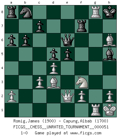 Last move : 1-0 2018 January 29 17:8:4 [Event "FICGS__CHESS__UNRATED_TOURNAMENT__000051"] [Site "FICGS"] [Date "2018.01.26"] [Round "1"] [White "Romig,James"] [Black "Capung,Albab"] [Result "1-0"] [WhiteElo "1900"] [BlackElo "1700"] 1.c4 e6 2.Nf3 b6 3.Nc3 h6 4.d4 Bb4 5.e4 Bb7 6.Bd3 Nf6 7.Qe2 O-O 8.O-O a6 9.Bf4 Bxc3 10.bxc3 d5 11.cxd5 exd5 12.e5 Nh5 13.Be3 Qe7 14.g4 Bc8 15.gxh5 Bg4 16.Kh1 Bxh5 17.Rg1 Qe6 18.Rg3 f6 19.Rag1 Rf7 20.Bxh6 fxe5 21.Rxg7+ Kh8 22.Rg8+ 1-0 English Opening Kingside Castling by player Black (move 7) Kingside Castling by player White (move 8) Player White won this chess game. Follow this game move after move (download)Chess makes man wiser and clear-sighted. (Vladimir Putin) Auf jeden Fall musst du zuerst Rechtsanwalt werden, damit du deine eigenen Interessen und die deiner Familie vertreten kannst. [Brief an seinen Sohn] (José Raúl Capablanca) El Ajedrez es de 30 a 40 por ciento psicología. Uno no cuenta con esto cuando se juega contra una computadora. No lo puedo confundir. (Judith Polgar) Shah mat. Le roi est mort. Cri de fierté d'un joueur venant de terrasser son adversaire, courtoisement, sans effusion de sang. Are you threatening me, Master Jedi ? (Chancellor Palpatine in Star Wars ep.3)