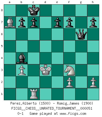 Last move : 0-1 2018 January 28 15:51:11 [Event "FICGS__CHESS__UNRATED_TOURNAMENT__000051"] [Site "FICGS"] [Date "2018.01.26"] [Round "1"] [White "Perez,Alberto"] [Black "Romig,James"] [Result "0-1"] [WhiteElo "1500"] [BlackElo "1900"] 1.e4 Nf6 2.Nc3 d5 3.e5 d4 4.exf6 dxc3 5.fxg7 cxd2+ 6.Bxd2 Bxg7 7.c3 Nc6 8.Nf3 Qd5 9.Qa4 Bd7 10.Qc4 Be6 11.Qb5 O-O-O 12.O-O-O Qxa2 13.Bd3 Rxd3 14.Qxd3 Nb4 15.Qb1 Qc4 16.b3 Nd3+ 17.Kc2 Qg4 18.Kxd3 Bf5+ 19.Ke2 Bxb1 20.Rxb1 Rd8 21.Rbd1 Bxc3 22.Be3 Qxg2 23.Rxd8 Kxd8 24.Rd1 Kc8 25.Rc1 Qg7 26.Kd3 Bb4 27.Bxa7 Qg6+ 0-1 Alekhine's defense : Scandinavian variation Queenside Castling by player Black (move 11) Queenside Castling by player White (move 12) Player Black won this chess game. Follow this game move after move (download)Fischer Chess play was always razor-sharp, rational and brilliant. One of the best ever. (Dave Regis) Mit sehr nachdenklichem Gesicht schreitet Bobby durch den Turniersaal. Was ist passiert?, fragt Lombardy. Ich stehe schlecht, antwortet Fischer. Lombardy: Dann biete doch einfach Remis an. Fischer: So schlecht stehe ich nun auch wieder nicht! (Robert James Fischer) La táctica fluye a partir de una posición superior. (Bobby Fischer) La vie est comme un jeu d'échecs : nous esquissons un plan, mais celui-ci est tributaire de ce que daignent faire l'adversaire aux échecs et le destin dans la vie. (Arthur Schopenhauer) Players are not good because they find tactics, it is about the way to find the positions in which those tactics are hidden. (Luc-Olivier Leclerc)