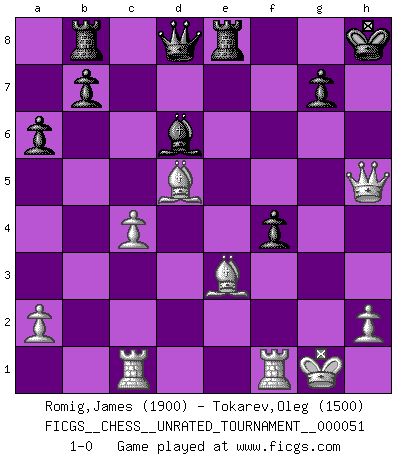 Last move : 1-0 2018 February 17 17:32:0 [Event "FICGS__CHESS__UNRATED_TOURNAMENT__000051"] [Site "FICGS"] [Date "2018.01.26"] [Round "1"] [White "Romig,James"] [Black "Tokarev,Oleg"] [Result "1-0"] [WhiteElo "1900"] [BlackElo "1500"] 1.c4 c5 2.Nf3 d6 3.Nc3 e6 4.g3 Be7 5.d4 cxd4 6.Nxd4 Nf6 7.Bg2 O-O 8.O-O Nbd7 9.e4 a6 10.f4 Rb8 11.Be3 Qc7 12.Rc1 Qa5 13.Qe2 Nc5 14.g4 e5 15.Nf5 Bxf5 16.exf5 Rfe8 17.fxe5 dxe5 18.g5 Nfd7 19.Nd5 Bd6 20.b4 Qd8 21.bxc5 Nxc5 22.Qh5 Nd3 23.g6 fxg6 24.fxg6 hxg6 25.Qxg6 Nf4 26.Nxf4 exf4 27.Bd5+ Kh8 28.Qh5+ 1-0 English : Symmetrical variation Kingside Castling by player Black (move 7) Kingside Castling by player White (move 8) Player White won this chess game. Follow this game move after move (download)A passed Pawn increases in strength as the number of pieces on the board diminishes. (Capablanca) Jeder Schachmeister war einmal ein Anfänger. (Irving Chernev) Una de estas pequeñas movidas modestas pudieran ser mas molestas a tu oponente que la amenaza mas grande. (Siegbert Tarrasch) Aidez vos pièces, elles vous aideront. (Paul Morphy) A good programmer is someone who always looks both ways before crossing a one-way street. (Doug Linder)
