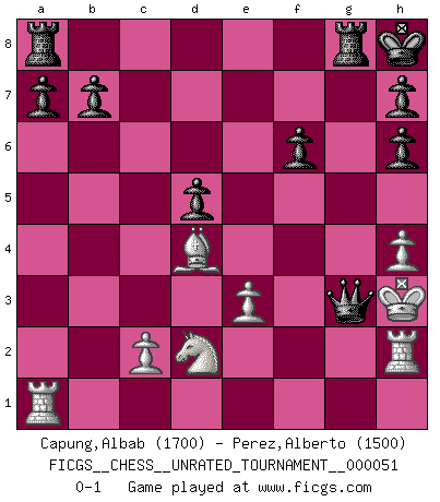 Last move : 0-1 2018 January 30 16:57:54 [Event "FICGS__CHESS__UNRATED_TOURNAMENT__000051"] [Site "FICGS"] [Date "2018.01.26"] [Round "1"] [White "Capung,Albab"] [Black "Perez,Alberto"] [Result "0-1"] [WhiteElo "1700"] [BlackElo "1500"] 1.e3 c5 2.Nf3 Nc6 3.a3 e6 4.g3 d5 5.Bb5 Bd7 6.b4 cxb4 7.axb4 Bxb4 8.Bxc6 Bxc6 9.Ne5 Nf6 10.Bb2 O-O 11.h4 Bd6 12.Ng4 e5 13.Nxe5 Qc7 14.Ng4 Ne4 15.Nh6+ Kh8 16.d3 Nxf2 17.Kxf2 Bxg3 18.Kg1 Be5 19.d4 Bxd4 20.Bxd4 Qg3 21.Kf1 Bb5 22.Qe2 Qf3 23.Kg1 Bxe2 24.Kh2 Qf2 25.Kh3 f6 26.Nd2 gxh6 27.Rh2 Bg4 28.Kxg4 Rg8 29.Kh3 Qg3 0-1 Van't Kruijs Opening Kingside Castling by player Black (move 10) Player Black won this chess game. Follow this game move after move (download)Weak points or holes in the opponent's position must be occupied by pieces not Pawns. (Siegbert Tarrasch) Schach wird sich dank seiner hohen kulturellen Tradition immer durchsetzen. In näherer Zukunft womöglich sogar als Gegenreaktion auf die maßlose Reizüberflutung im Freizeit- und Spielbereich. (Garry Kasparov) Tu puedes aprender mucho mas de una partida que pierdas que de una partida ganada. Tendras que perder cientos de partidas antes de llegar a ser un buen jugador. (Jose Raul Capablanca) La conception d'un plan est le processus par lequel un joueur exploite les avantages de sa position tout en s'efforçant d'en réduire au minimum les inconvénients. Afin de garantir le succès, un plan doit toujours se fonder sur un diagnostic objectif des particularités d'une position. La conception d'un plan est d'autant plus difficile que la position est équilibrée, et grandement facilitée lorsqu'il n'existe qu'un seul plan susceptible de répondre aux exigences de la position. (Harry Golombek) I have opinions of my own - strong opinions - but I don't always agree with them. (George Bush)