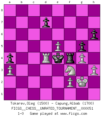 Last move : 1-0 2018 March 19 19:42:35 [Event "FICGS__CHESS__UNRATED_TOURNAMENT__000051"] [Site "FICGS"] [Date "2018.01.26"] [Round "1"] [White "Tokarev,Oleg"] [Black "Capung,Albab"] [Result "1-0"] [WhiteElo "1500"] [BlackElo "1700"] 1.e4 e6 2.Nf3 h6 3.d4 c5 4.c3 cxd4 5.cxd4 Qb6 6.Be2 Nf6 7.Nc3 Bb4 8.Qd3 Nc6 9.a3 Bxc3+ 10.bxc3 Ne7 11.O-O Qc6 12.Nd2 b6 13.Bf3 Qa4 14.d5 Ng6 15.Re1 O-O 16.dxe6 fxe6 17.e5 Ba6 18.Qd4 Qxd4 19.cxd4 Nd5 20.Bxd5 exd5 21.Nf3 Rac8 22.h3 Rce8 23.Bd2 Nf4 24.Bb4 Rf7 25.Ra2 Ref8 26.Bxf8 Rxf8 27.Nh2 Nd3 28.Rf1 Rf4 29.Nf3 g5 30.Nh2 Bc4 31.Rd2 Rxd4 32.Rfd1 b5 33.Nf3 Re4 34.Rxd3 Bxd3 35.Rxd3 Kf7 36.Rxd5 Ke6 37.Rxb5 Ra4 38.Rb3 a5 39.g4 Rf4 40.Kg2 a4 41.Rb6+ Kd5 42.Rd6+ Ke4 43.Rd4+ 1-0 French defense Kingside Castling by player White (move 11) Kingside Castling by player Black (move 15) Player White won this chess game. Follow this game move after move (download)He who fears an isolated Queen's Pawn should give up Chess. (Siegbert Tarrasch) Das Zentrum ist der Balkan des Schachbretts - Kriegshandlungen können in jedem Moment ausbrechen. (Aaron Nimzowitsch) La vida es como el Ajedrez, con lucha, competición y eventos buenos y malos. (Benjamin Franklin) Vous m'avez demandé de vous exposer quel est le fondement de la prière. Je ne fais que préparer les pièces du jeu sur la table... Nous sera-t-il permis d'en adopter les règles et si nous les appliquons scrupuleusement nous ne tarderons pas à faire mat le Roi divin ! Il ne pourra échapper à nos mains. (Sainte Thérèse d'Avila, Chemin de perfection) The obstacle is the path. (Zen proverb)