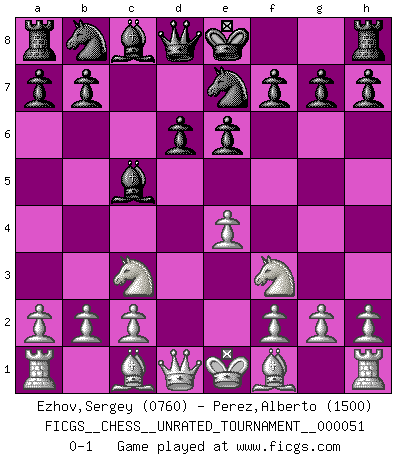 Last move : 0-1 2018 March 8 16:53:55 [Event "FICGS__CHESS__UNRATED_TOURNAMENT__000051"] [Site "FICGS"] [Date "2018.01.26"] [Round "1"] [White "Ezhov,Sergey"] [Black "Perez,Alberto"] [Result "0-1"] [WhiteElo "0760"] [BlackElo "1500"] 1.e4 e6 2.d4 c5 3.dxc5 Bxc5 4.Nf3 d6 5.Nc3 Ne7 0-1 This chess game has been lost on time (started : 2018.01.26 10:57:54) French defense Player Black won this chess game. Follow this game move after move (download)Fischer Chess play was always razor-sharp, rational and brilliant. One of the best ever. (Dave Regis) Konzentriere dich auf materielle Gewinne. Nimm, was dir dein Gegner gibt, ausser es gibt einen guten Grund der dagegenspricht. (Robert James Fischer) En manos de Fischer's, una diminuta ventaja teórica es tan buena como tener una Reina de ventaja. (Isaac Kashdan) Karpov est une pièce de musée. (Garry Kasparov) When the going gets tactical, the computers get going. (Hyatt)