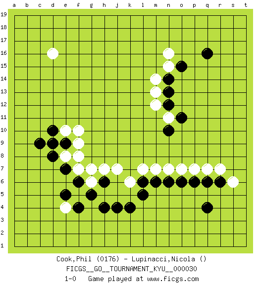 Last move : 1-0 2007 May 15 23:12:24 [Event "FICGS__GO__TOURNAMENT_KYU__000030 "] [Site "FICGS"] [Date "2007.04.22"] [Round "1"] [Black "Cook,Phil "] [White "Lupinacci,Nicola "] [Result "1-0"] [Rating 1 "0176"] 1.q4 d16 2.q16 e4 3.h4 n16 4.f4 f5 5.g5 g6 6.h6 h7 7.f6 g7 8.e5 f7 9.e7 j7 10.k4 l7 11.l5 n7 12.n6 o7 13.o6 p7 14.p6 q7 15.q6 r7 16.r6 s6 17.l6 m7 18.m6 k6 19.j4 e8 20.d8 d9 21.e9 f8 22.d10 f9 23.c9 e10 24.d9 f10 25.o15 n15 26.n14 m14 27.n13 m13 28.n12 m12 29.o11 n11 30.n10 1-0 Here are the names of the openings (joseki) played in the four corners : Corner d4 : e4 h4Takamoku (Gomok, Gaomu`) 5-4 Point. The takamoku (high) point (5-4). With its emphasis on influence, the 5-4 point complements the 4-4 (hoshi) point in creating an influence-oriented fuseki. Corner q16 : q16 n16Hoshi (Hwajeom, Seongjeom, Xingwei`) 4-4 Point. The star or hoshi (4-4) point, emphasizing influence at the potential expense of territory.Nikken Takagakari (Dukan Nop'dakeolch'im, E`r Gaojia, 2-Space High Approach). White 2 is a light approach move. Rarely played in even games, White 2 is typically employed in handicap games. Black continues with 6-4 or 3-10. In Korean Sunjang Baduk Black has a stone on 8-4. Corner q4 : q4 l7Hoshi (Hwajeom, Seongjeom, Xingwei`) 4-4 Point. The star or hoshi (4-4) point, emphasizing influence at the potential expense of territory. Player Black won this Go (weiqi, baduk) game.Follow this game move after move (download ) On the third line, four die, six live. (Anonymous) A shortcut is the longest distance between two points. (Don Groves)